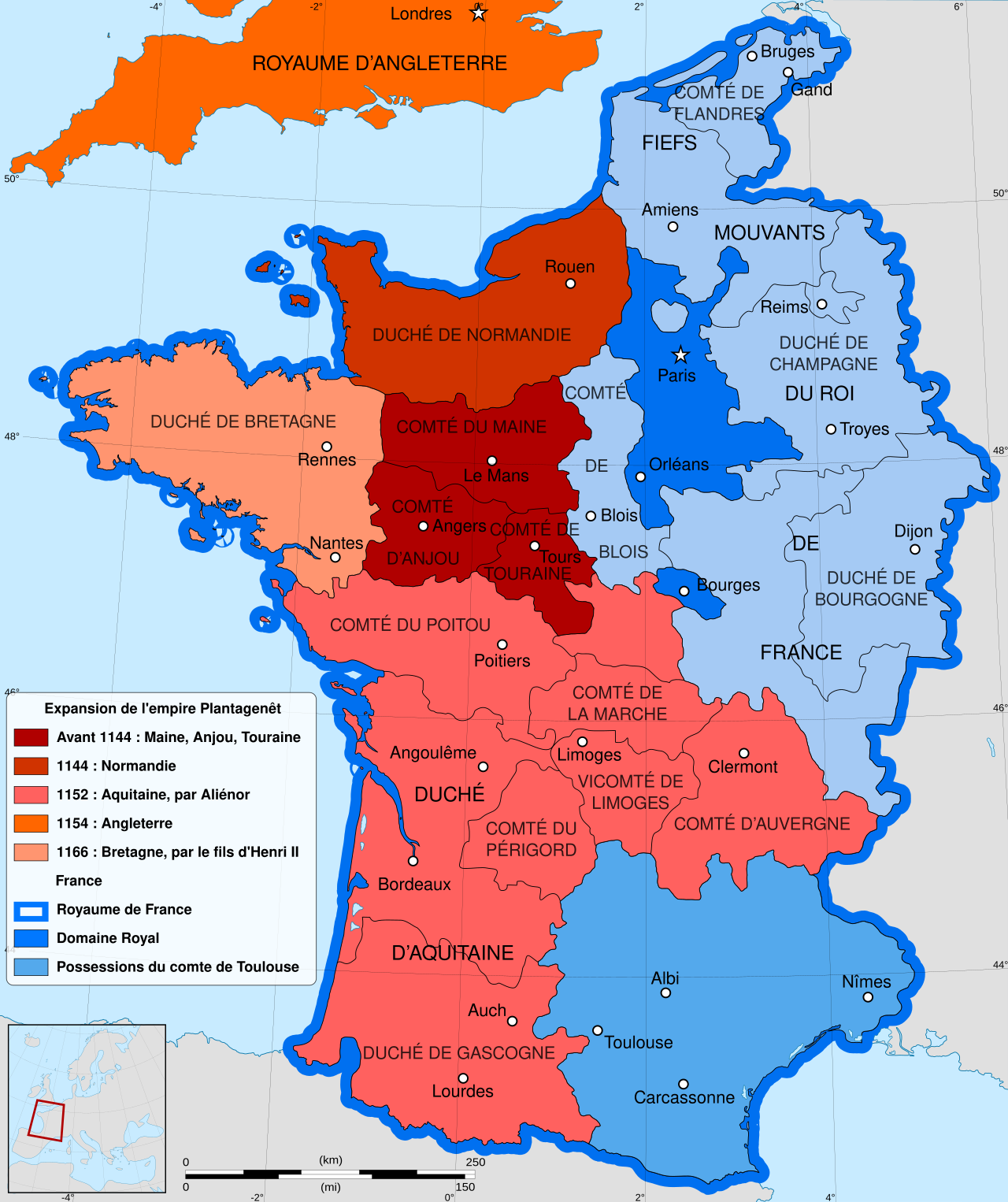 Henri II est à la tête d’un empire qui s’étend de l’Écosse à la frontière espagnole, comprenant l’Angleterre, la Normandie, l’Anjou, et l’Aquitaine. Cet ensemble, souvent appelé "Empire angevin", ou "Empire Plantagenêt" repose cependant sur des alliances fragiles et des tensions constantes.
