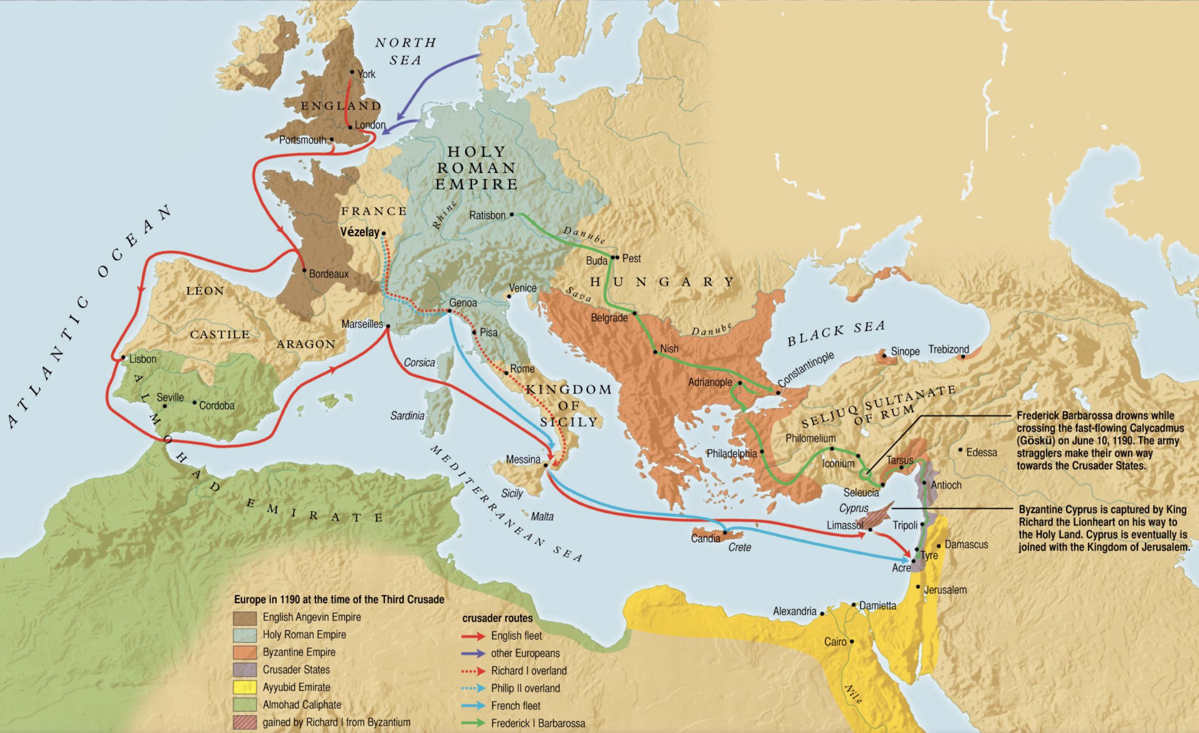 Carte : les routes de la troisième croisade (celle suivie par Richard est en rouge)​