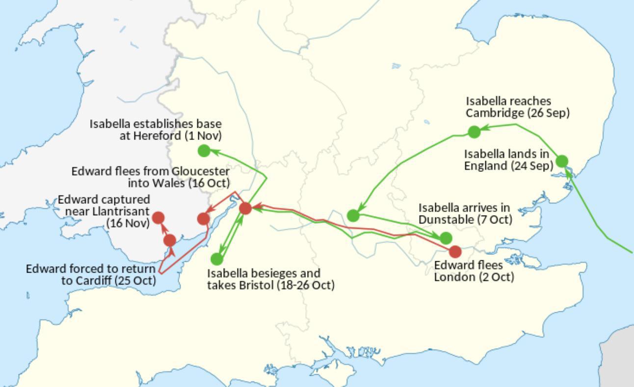 En 1326, Isabelle et Mortimer lèvent une petite armée avec l’aide de nobles mécontents et de soutiens français. Ils débarquent en Angleterre à Harwich en septembre, où ils rencontrent peu de résistance. Grâce à leur popularité croissante et à l’impopularité des Despenser, ils rallient rapidement des soutiens parmi la noblesse et les barons. La révolte culmine avec la capture d’Édouard II et l’exécution des Despenser, mettant fin à leur domination sur le royaume.