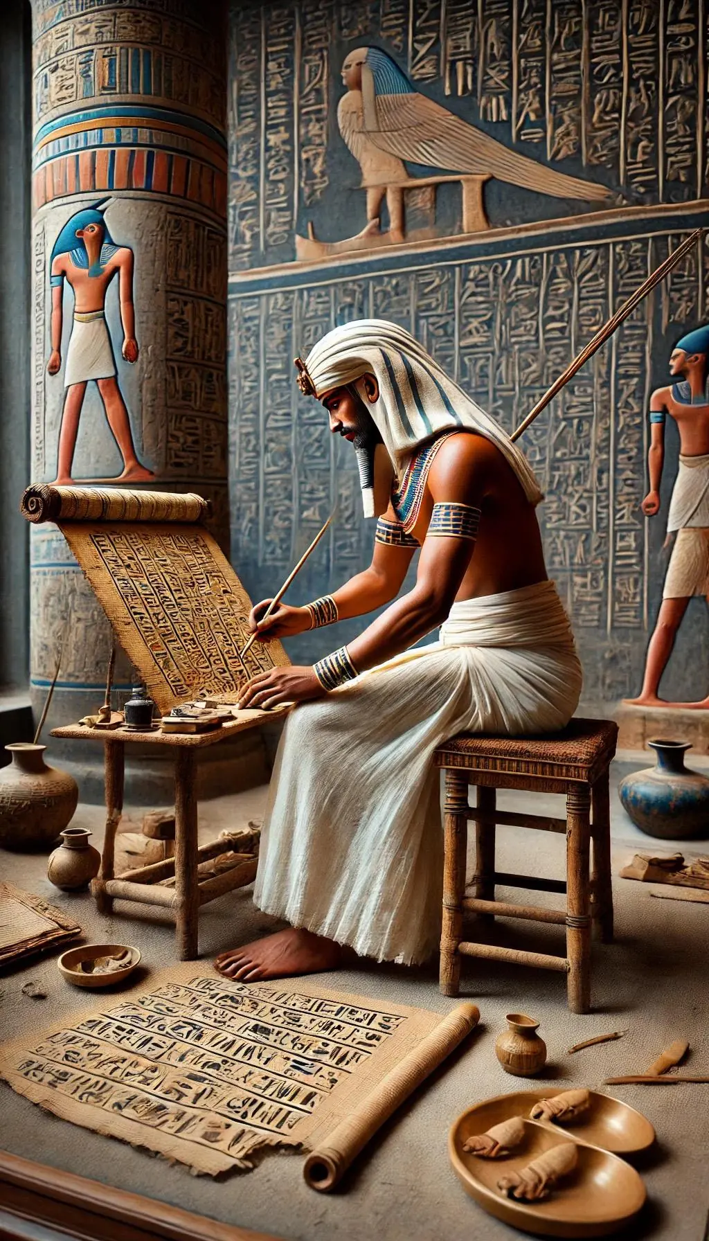 Les scribes de l'Égypte antique constituaient une classe privilégiée, essentielle au fonctionnement de la société. Ils étaient généralement issus de familles nobles et bénéficiaient d'une éducation spécialisée dans des écoles affiliées à des temples ou à des palais royaux. Leur formation incluait l'apprentissage de l'écriture hiéroglyphique, mais également tout un ensemble de savoirs mathématiques, comptables, et littéraires.