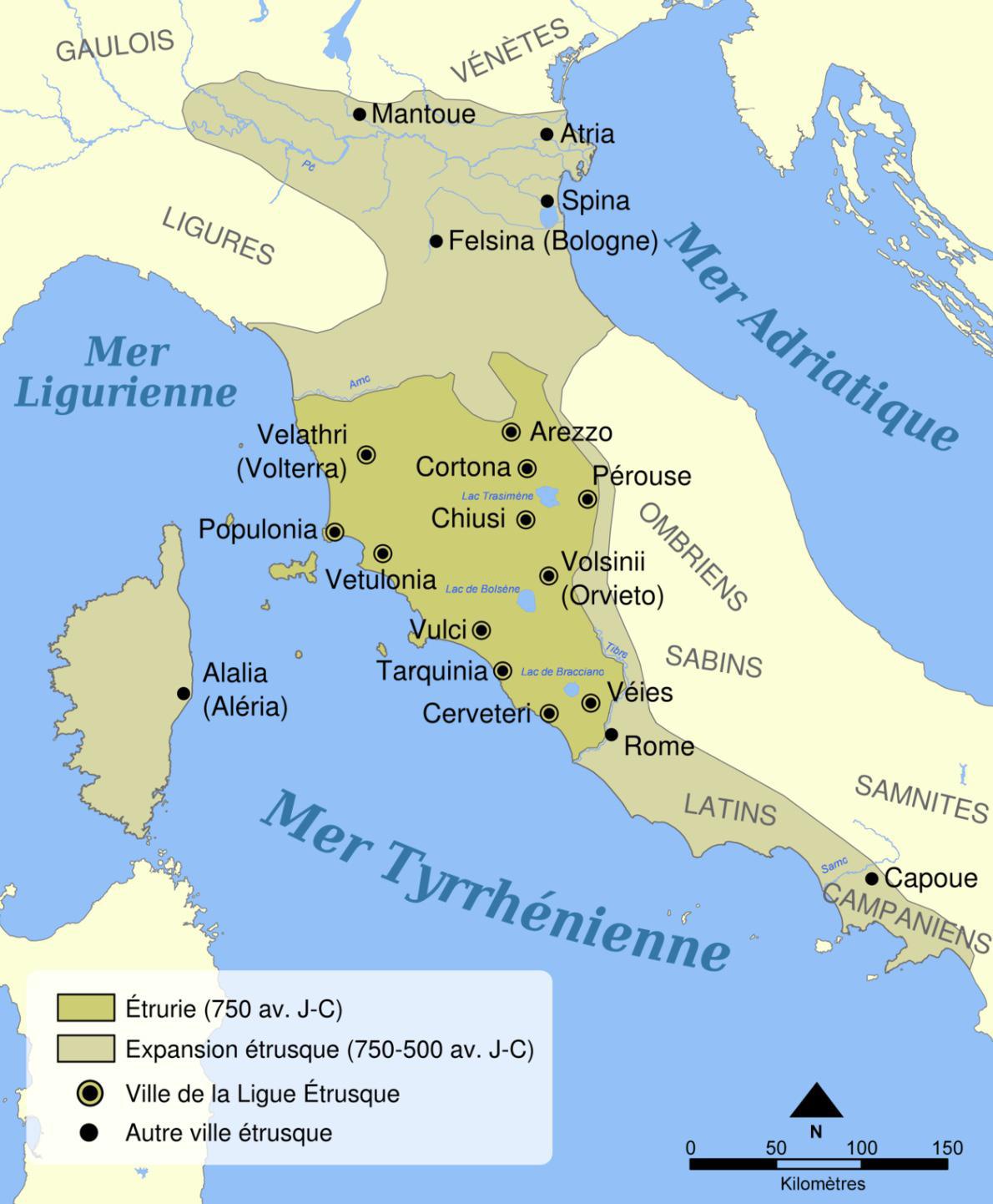 Les Étrusques vivaient principalement en Étrurie, correspondant à l'actuelle Toscane, au nord du Latium et à l'ouest de l'Ombrie. Leur origine ethnique reste débattue, oscillant entre une hypothèse autochtone et une hypothèse orientale, qui ferait d'eux un peuple immigré venu de lydie ou d'Anatolie.