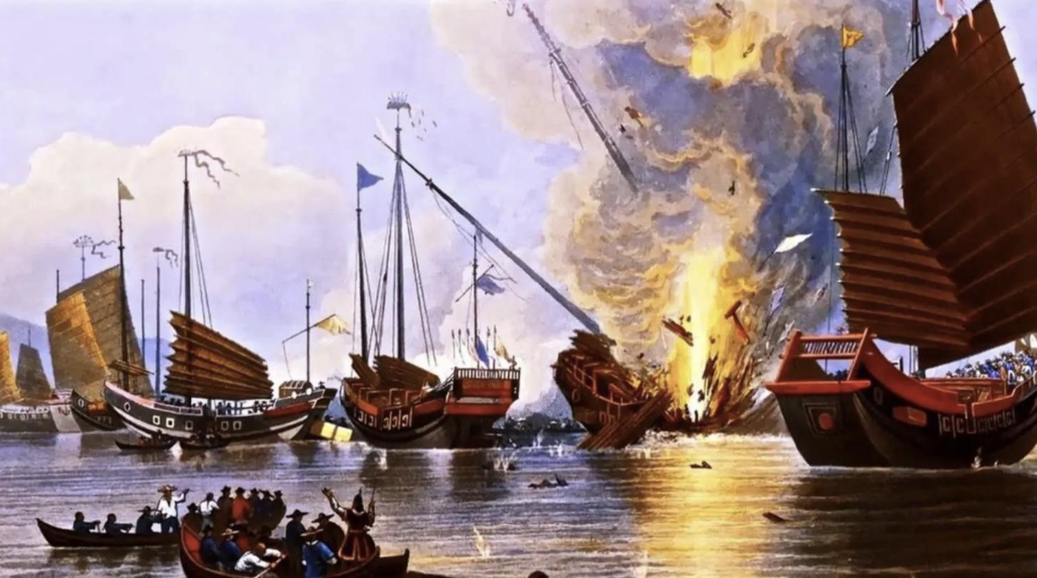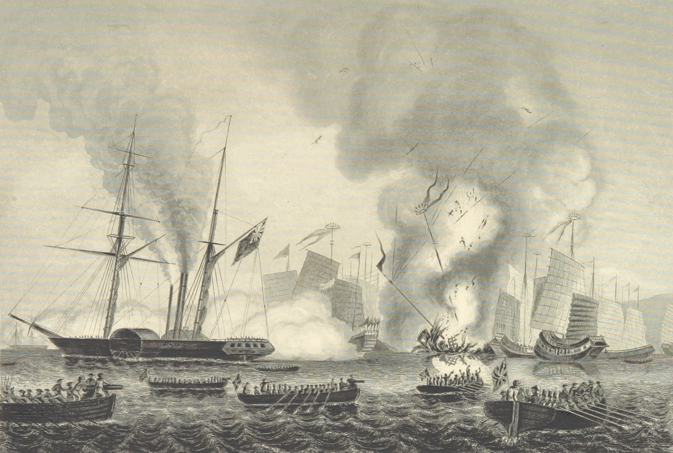Une flotte chinoise de 14 jonques est détruite par le Nemesis, premier navire à vapeur et à coque en fer, lors de la bataille de Chuenpi. La supériorité technologique britannique apparaît criante.