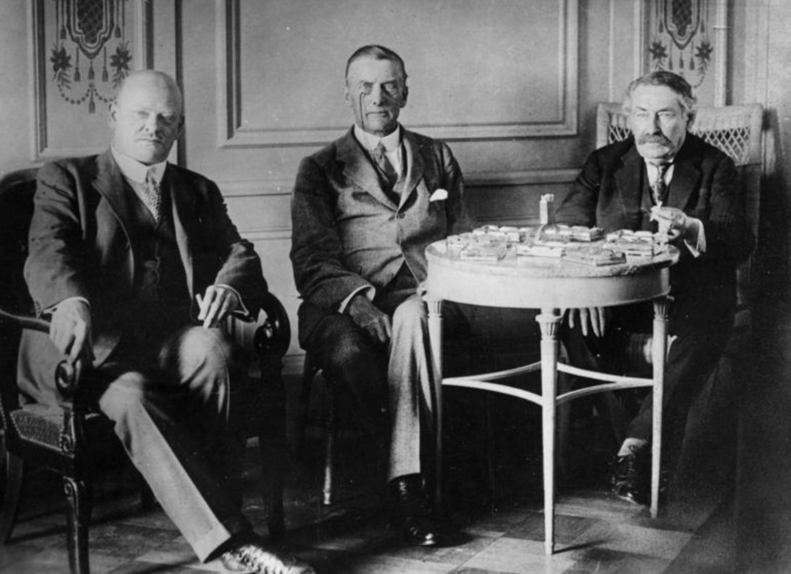 Stresemann (gauche) ; Austen Chamberlain et Arsistide Briand (droite), représentant l'Allemagne, le Royaume-Uni et la France lors de la conférence de Locarno, qui doit statuer sur les frontières de plusieurs pays européens.
