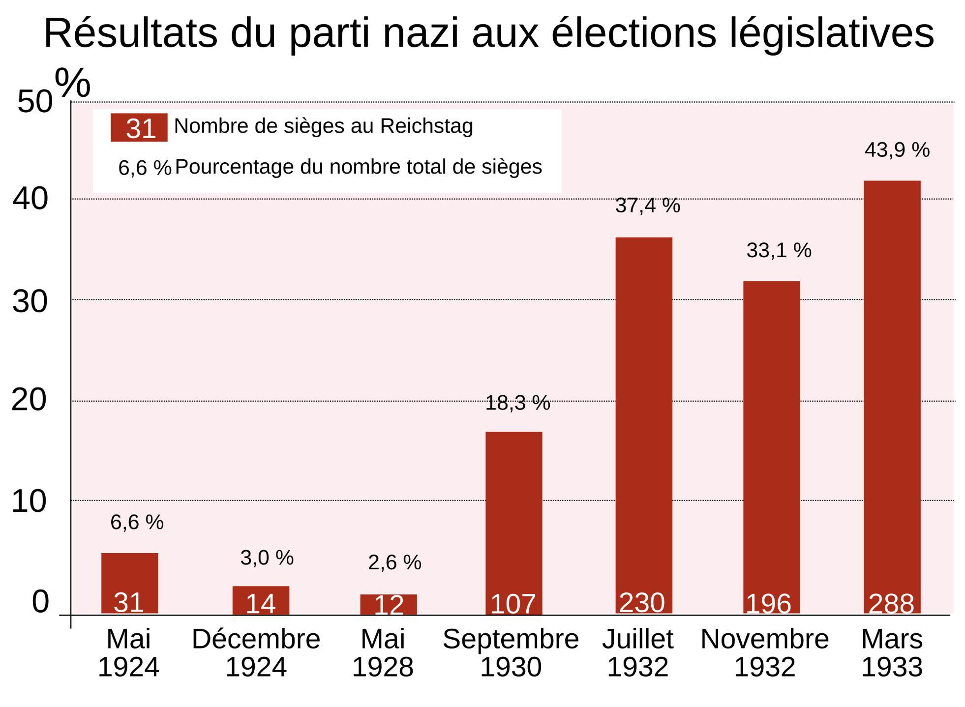 Aux élections de 1930, le NSDAP passe de 2,6 % à 18,3 %, devenant le deuxième parti du pays. Deux ans plus tard, en juillet 1932, il obtient 37,3 % des voix et devient le premier parti au Reichstag.