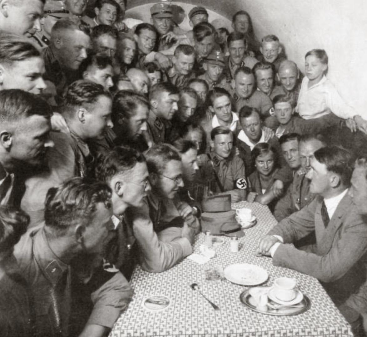 Image de propagande : des partisans se bousculent pour écouter Adolf Hitler, dans une brasserie bavaroise.