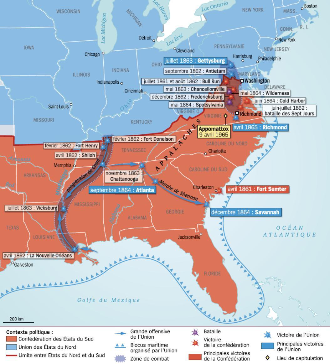 L’Union l’a emporté grâce à sa supériorité industrielle et à l’épuisement progressif de la Confédération. Politiquement, la guerre a vu l’évolution décisive de ses objectifs : de la simple préservation de l’Union à la lutte pour l’abolition de l’esclavage. Socialement, elle a mobilisé et transformé l’ensemble de la population, brisant des structures anciennes et en forgeant de nouvelles.