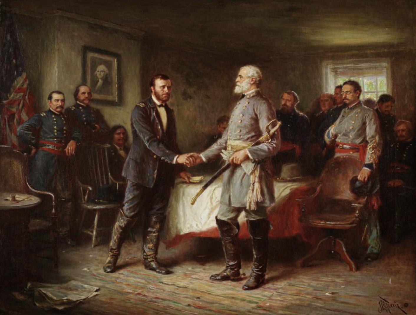L’année 1865 marque l’effondrement final de la Confédération. L’armée sudiste, épuisée, affamée, en manque d’hommes et de munitions, recule sur tous les fronts. Le 9 avril, Lee capitule face à Grant à Appomattox Court House. Apprenant la capitulation de Lee, les généraux confédérés se rendent uns à uns. C’est la fin militaire de la Confédération. La guerre est terminée, mais la réconciliation est loin d’être acquise.