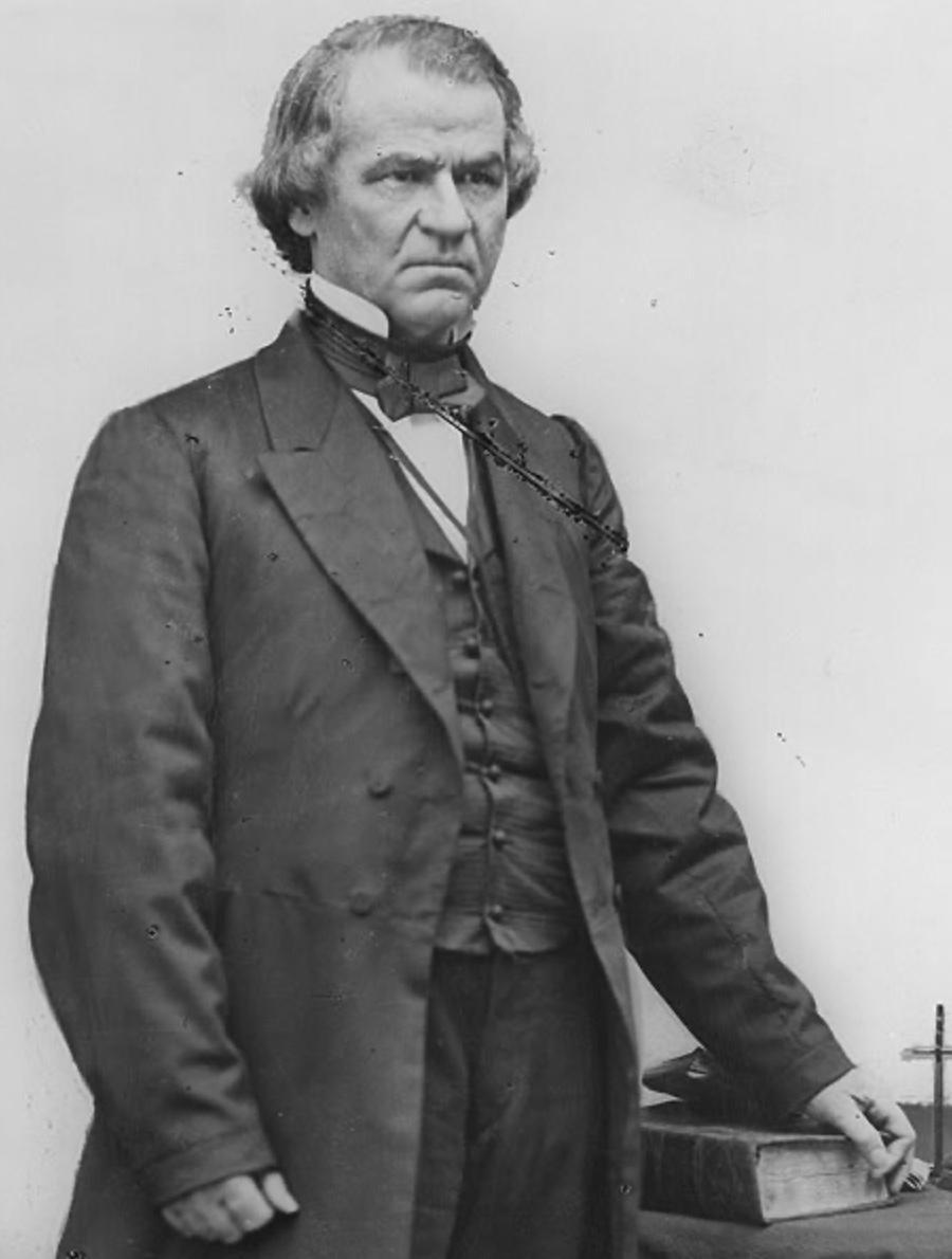 Andrew Johnson, démocrate sudiste resté loyal à l’Union, devient président après l’assassinat de Lincoln. Favorable à une vision minimaliste de la Reconstruction, il accorde des pardons massifs aux anciens dirigeants confédérés et s'oppose à toute idée de réforme sociale profonde.