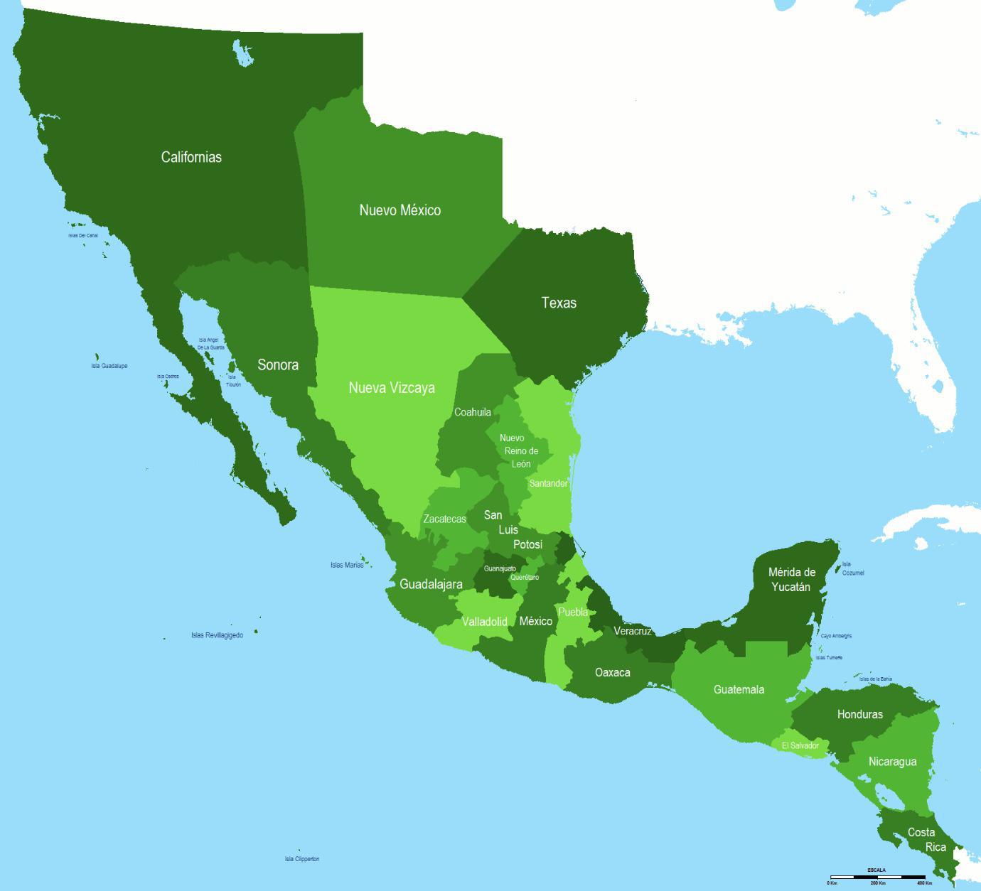 Aux XVIIIe et début XIXe siècles, l’Espagne colonise lentement l’intérieur du continent nord-américain à partir du Mexique. Les régions du Nouveau-Mexique, de la Californie, du Texas et de l’Arizona sont intégrées à la Nouvelle-Espagne. La couronne y établit un réseau de missions religieuses, de postes militaires (présidios) et de villages de colons. Son objectif est d'évangéliser les peuples autochtones et d'affirmer sa souveraineté sur ces territoires, face aux puissances concurrentes.