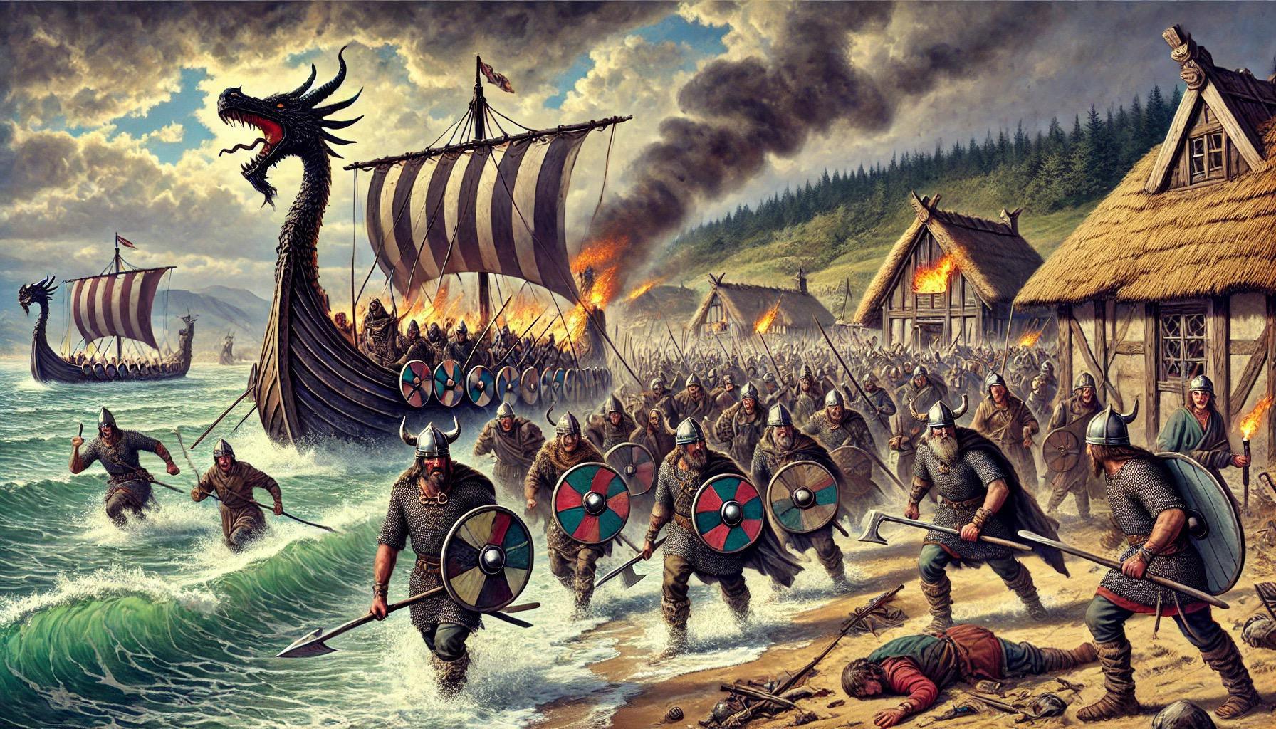 - Les Îles Britanniques : Les premières attaques documentées en Europe ont lieu dans les îles britanniques, en particulier en Angleterre et en Écosse. En 793, le monastère de Lindisfarne est attaqué par les Vikings, marquant le début d’une série de raids qui vont dévaster l’Angleterre. Les Vikings établissent des bases permanentes, et le royaume anglo-saxon de Northumbrie tombe sous leur domination. En 865, la Grande Armée Viking, une coalition de forces scandinaves, envahit l’Angleterre et conquiert plusieurs royaumes anglo-saxons, établissant le "Danelaw", une zone sous contrôle viking qui dure jusqu’au XIᵉ siècle.