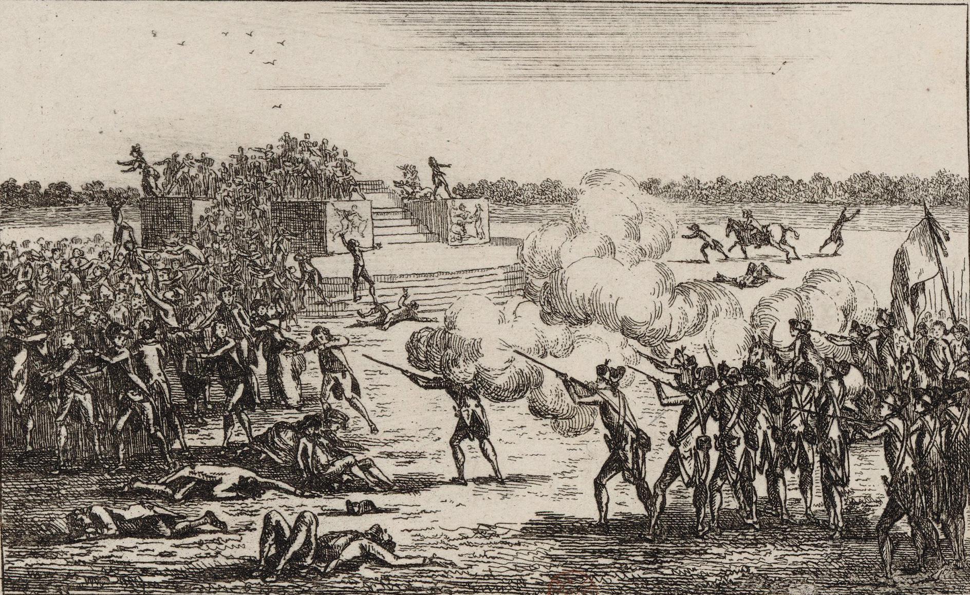 Le 17 juillet 1791, des milliers de Parisiens se rassemblent pacifiquement au Champ-de-Mars pour signer une pétition réclamant la fin de la monarchie. Lafayette et Bailly, craignant que la situation ne dégénère, envoient la Garde nationale pour disperser la foule. Dans des circonstances troubles, les soldats ouvrent le feu, faisant une cinquantaine de morts.