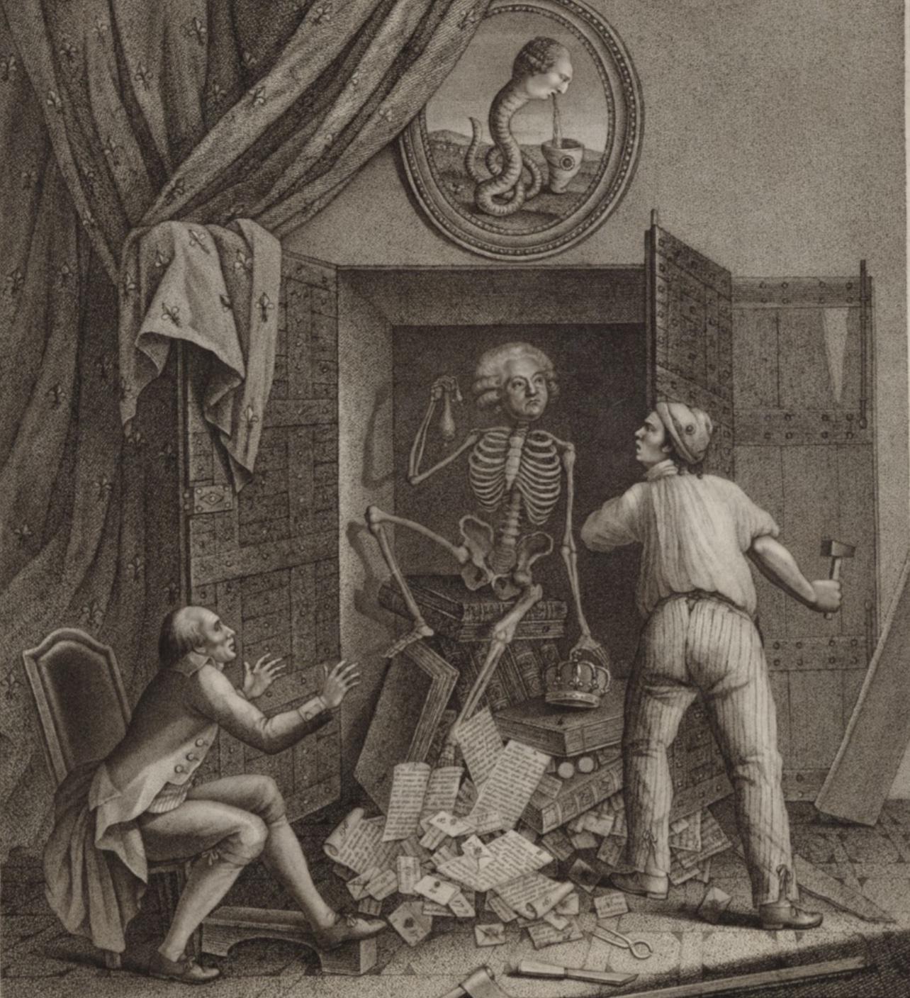 Caricature : la découverte de l'armoire de fer, bien dissimulée dans un mur du palais des Tuileries