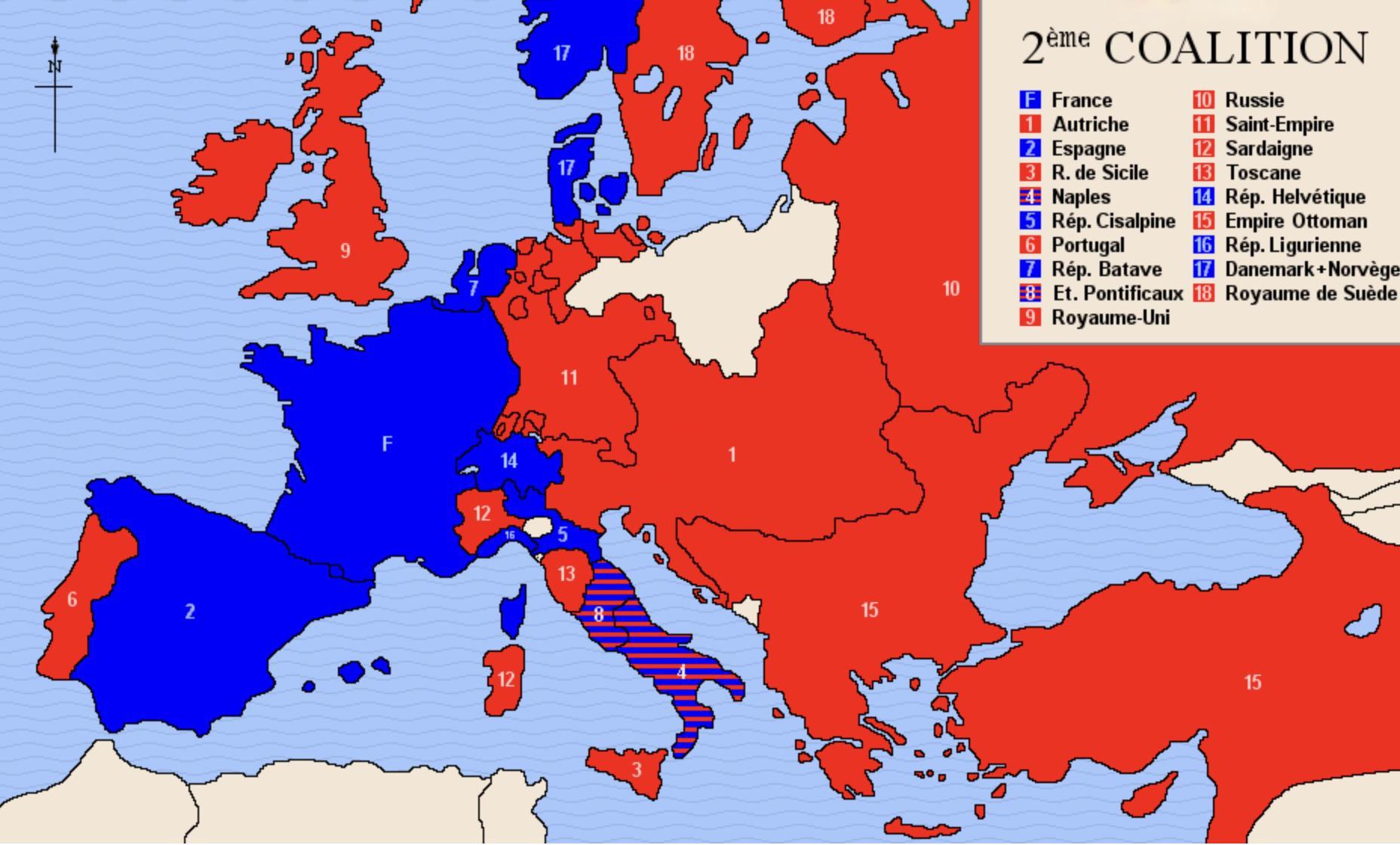 À la fin de l’année 1798, la guerre est déclarée. L’Angleterre, l’Autriche et la Russie forment le cœur de cette nouvelle alliance, bientôt rejoints par Naples, le Portugal et l’Empire ottoman.