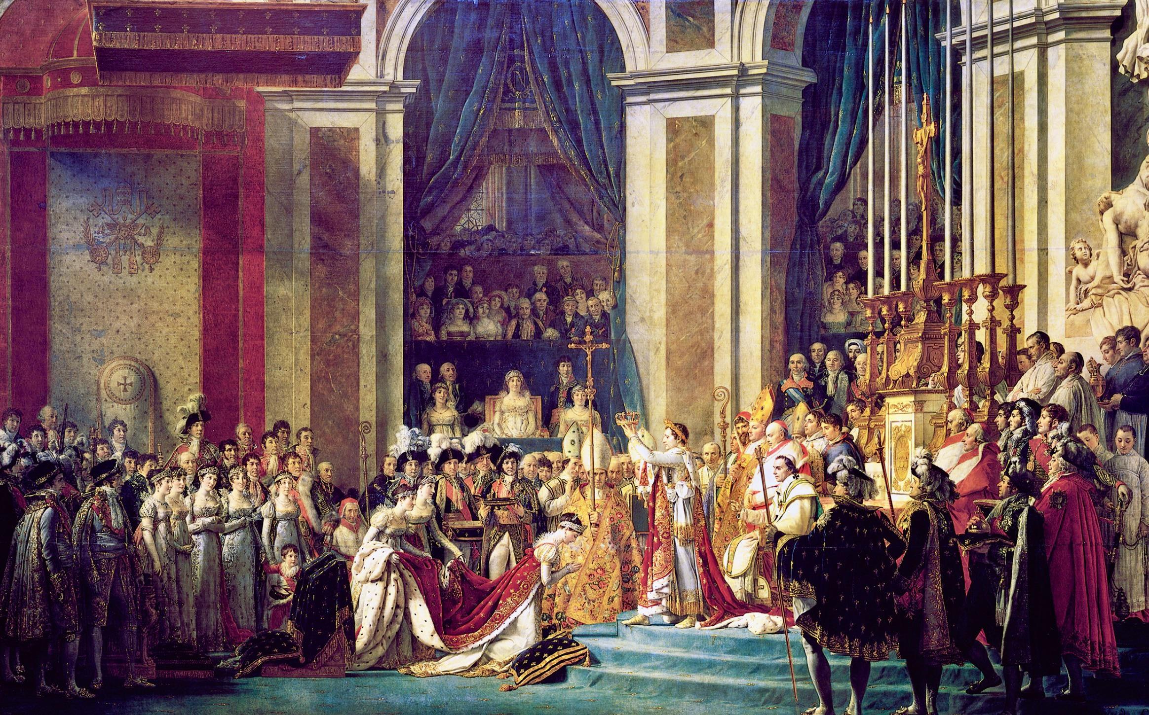 La cérémonie du sacre a lieu à Notre-Dame de Paris, en présence du pape Pie VII. Mais dans un geste hautement symbolique, Napoléon retire la couronne des mains du pape et se couronne lui-même, affirmant ainsi une rupture avec la monarchie traditionnelle : son pouvoir vient du peuple et non de l’Église.