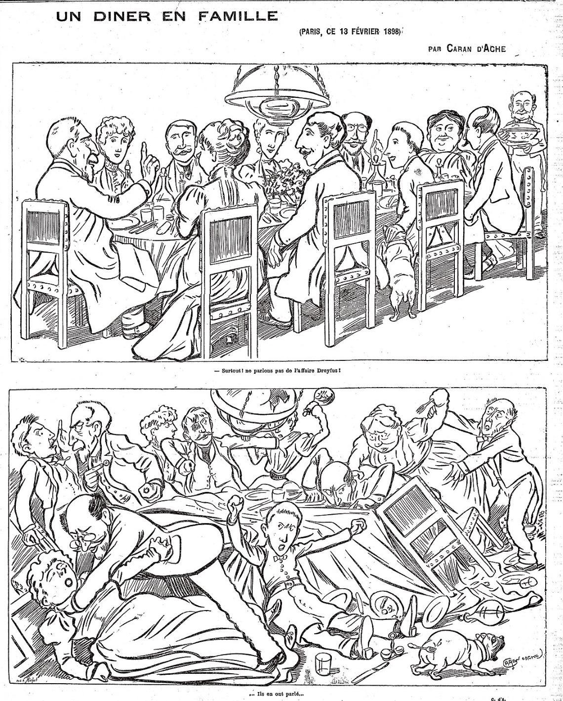 Caricature : dîner en famille, "Surtout, ne parlons pas de l'affaire Dreyfus !"