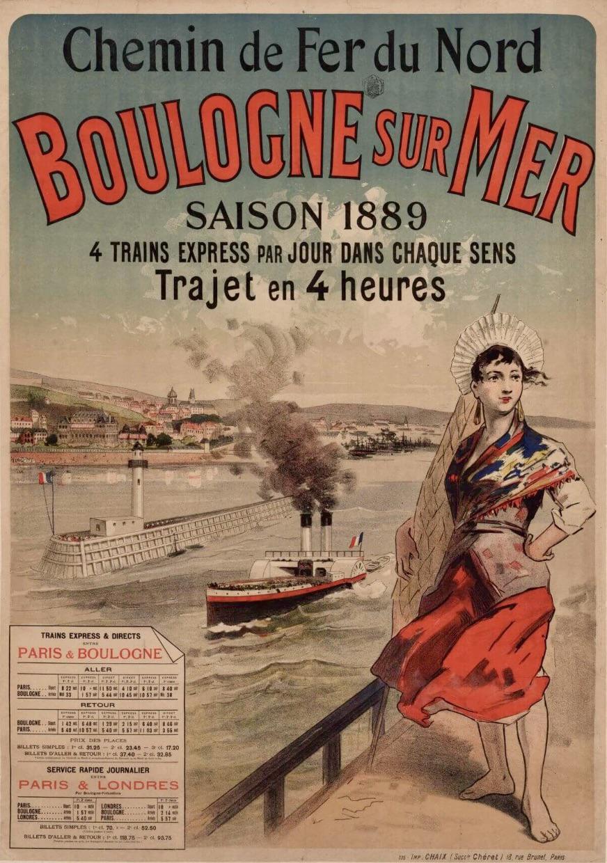 Publicité : le train relie Paris à Boulogne en 4 heures, en 1889. La bourgeoisie de la capitale peut passer ses week-end sur la Manche.