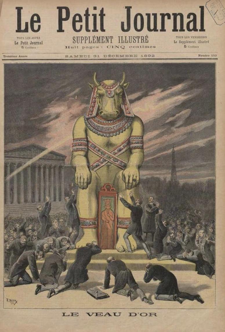 Caricature du Petit Journal : les députés se prosternent devant le Veau d'Or (l'argent), et trahissent les valeurs de la République.
