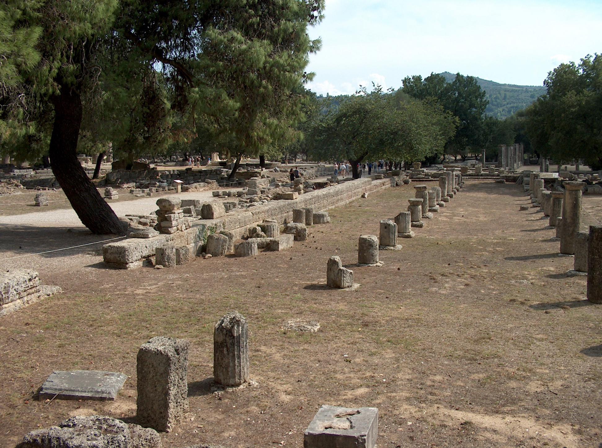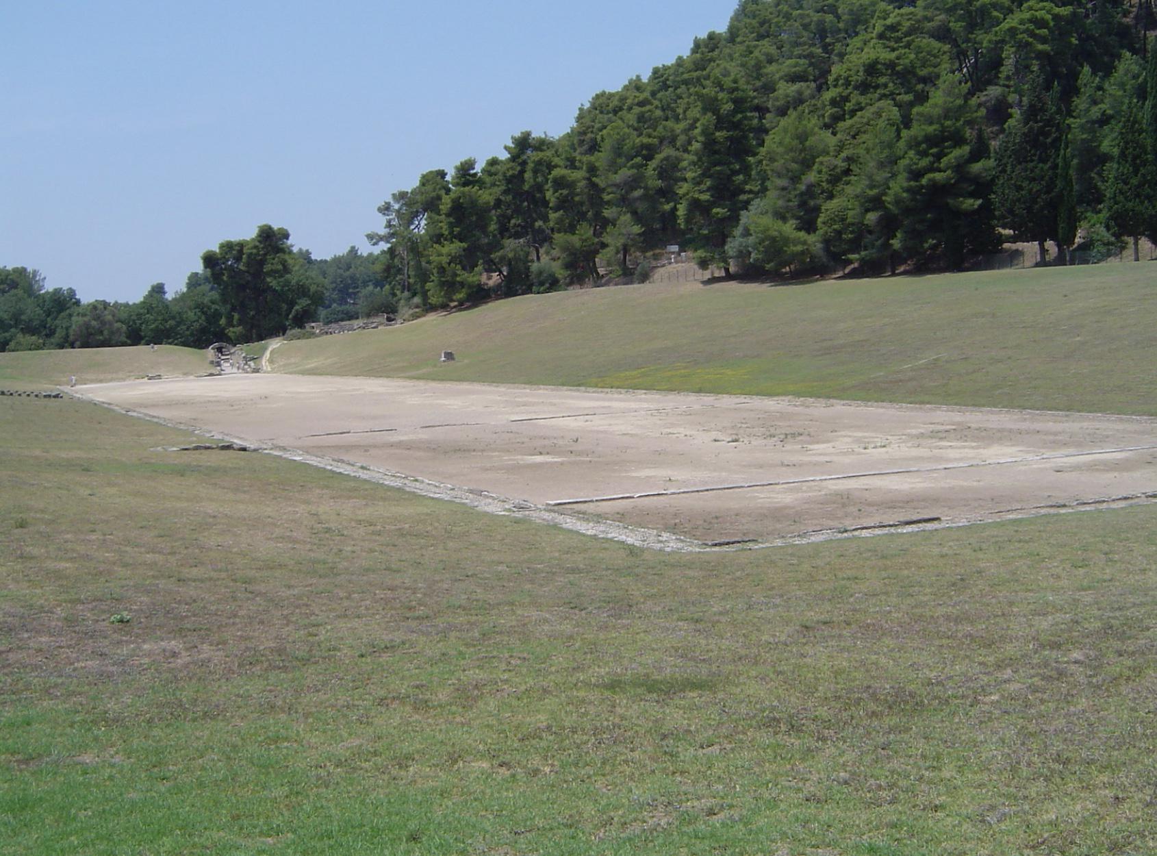 Sur le site d'Olympie, on peut encore voir le lieu des compétitions avec deux pierres rainurées qui délimitent la longueur d'un stade. Le public se tenait de part et d'autre de la piste sur de simples talus.