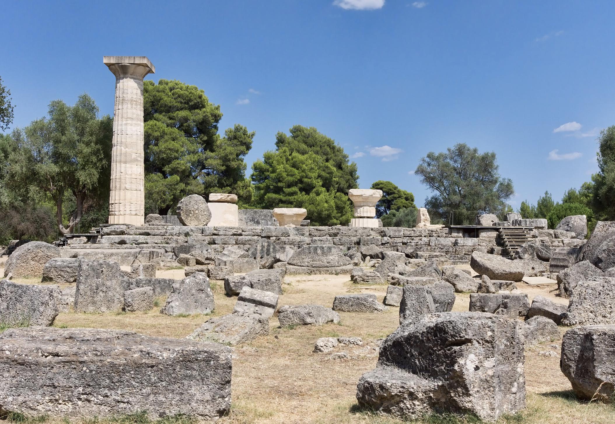 Dans l'enceinte sacrée, le temple le plus ancien était celui d'Héra, mais le plus renommé était évidemment celui de Zeus, que le sculpteur Phidias avait embelli au Ve siècle av. J.-C. avec une statue monumentale du dieu, de plus de 12 mètres.