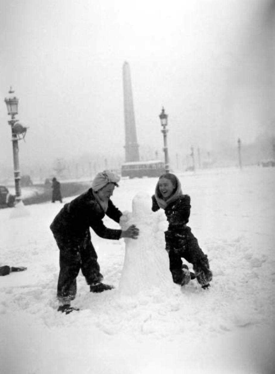 Un bonhomme de neige, place de la Concorde. L'insouciance des parisiens fait presque oublier la violence de l'hiver 46-47, qui fera des milliers de morts d'hypothermie et de malnutrition, dans une Europe qui n'a plus de charbon pour se chauffer.