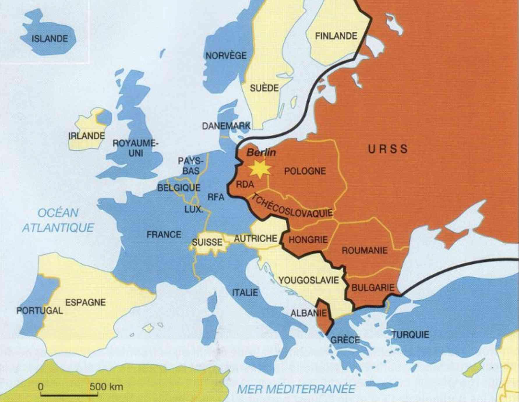 Carte : l'Europe en 1948. En rouge, le bloc communiste. En bleu, les pays membres de l'OTAN (la Grèce et la Turquie rejoindront en 1952 ; la RFA en 1955)