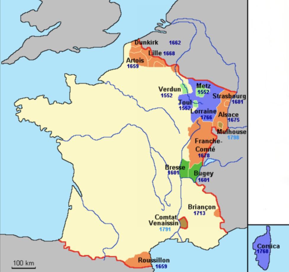 Carte : l'expansion française à partir du XVIème siècle. En bleu, les annexions de Louis XV (la Lorraine et la Corse)