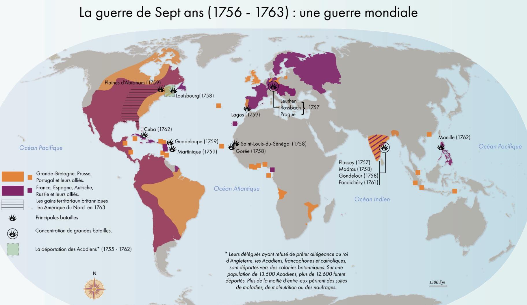 En Amérique du Nord, la bataille des Plaines d’Abraham (1759) entraîne la chute de Québec et la perte du Canada au profit des Anglais. En Inde, les Français doivent abandonner leurs ambitions face à la Compagnie anglaise des Indes orientales.