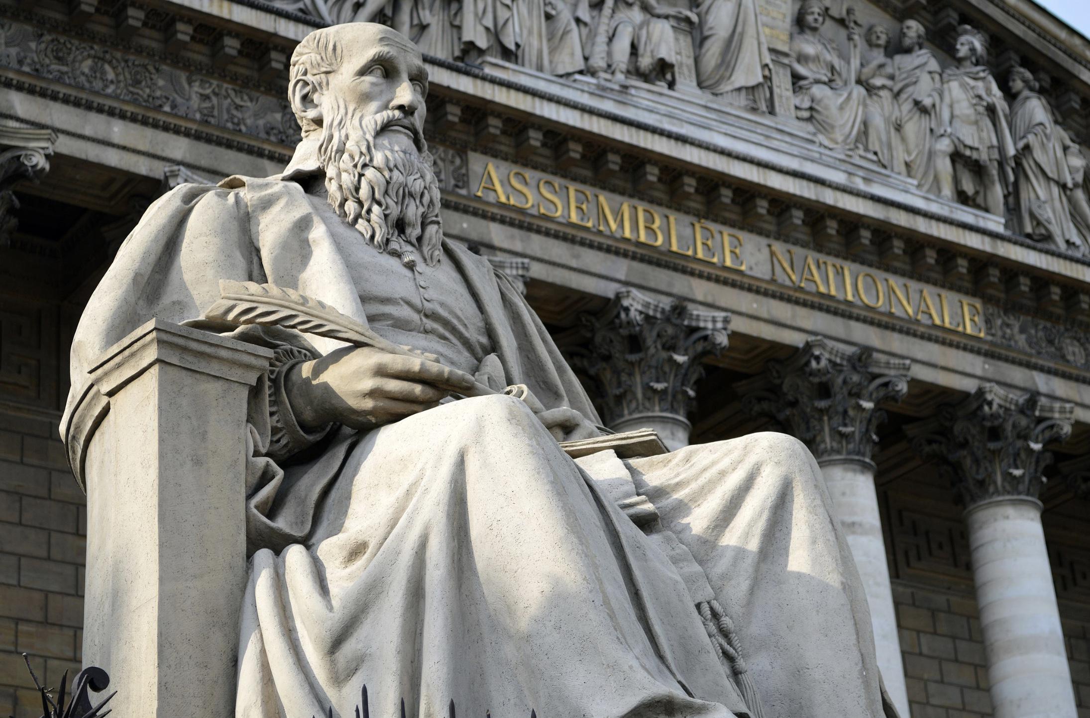 Statue de Michel de l'Hospital devant l'assemblée nationale. Humaniste et conseiller de la couronne, il va oeuvrer dans les coulisses pour preserver la paix religieuse. Il est l'artisan principal de l'édit de Saint-Germain.