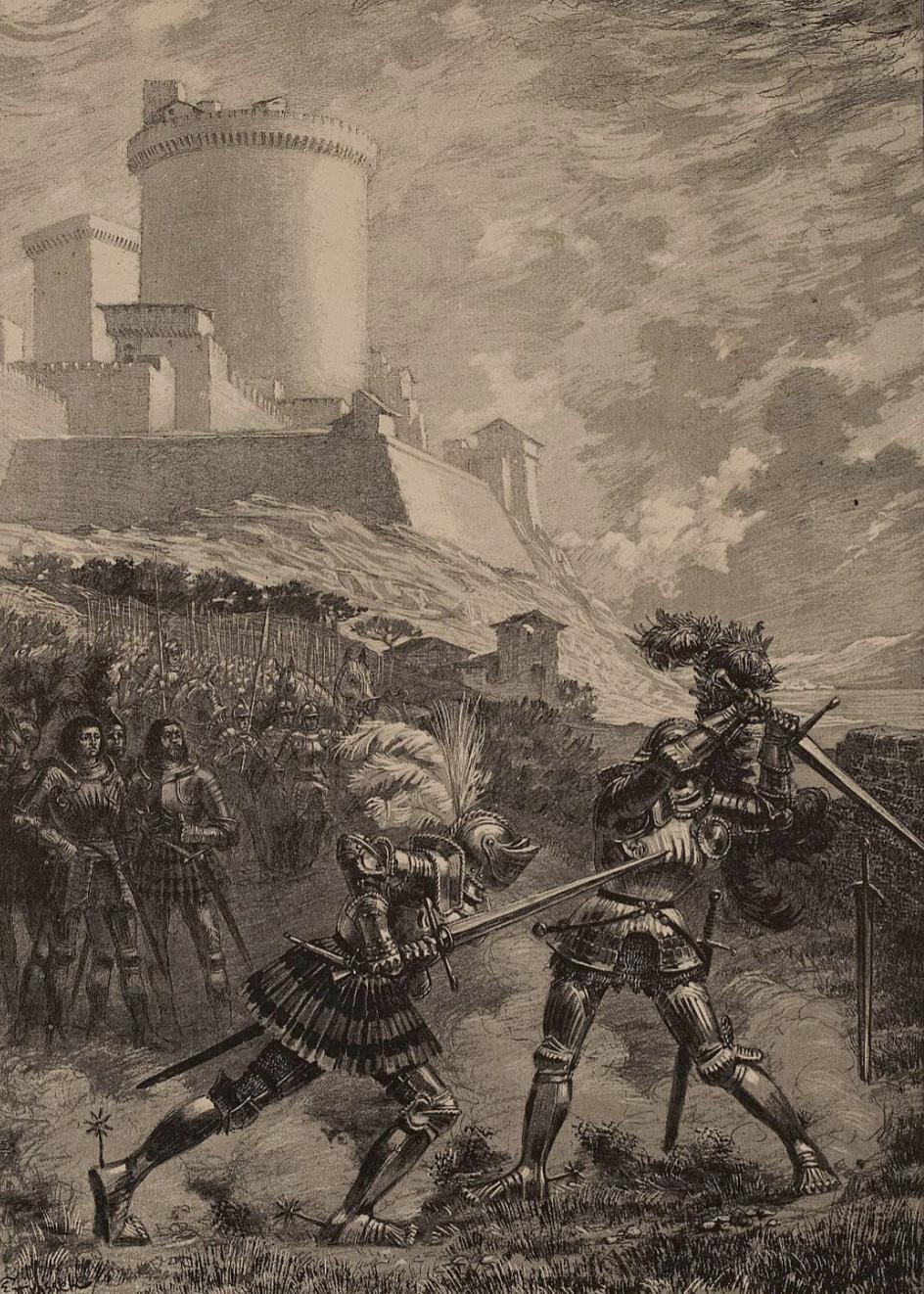 La même année, il réalise l’un de ses plus grands exploits en défendant, seul et sans armure, le pont de Garigliano contre une armée espagnole. Alors que ses compagnons se replient, il retarde l’avancée ennemie avec une endurance et une adresse incroyables.