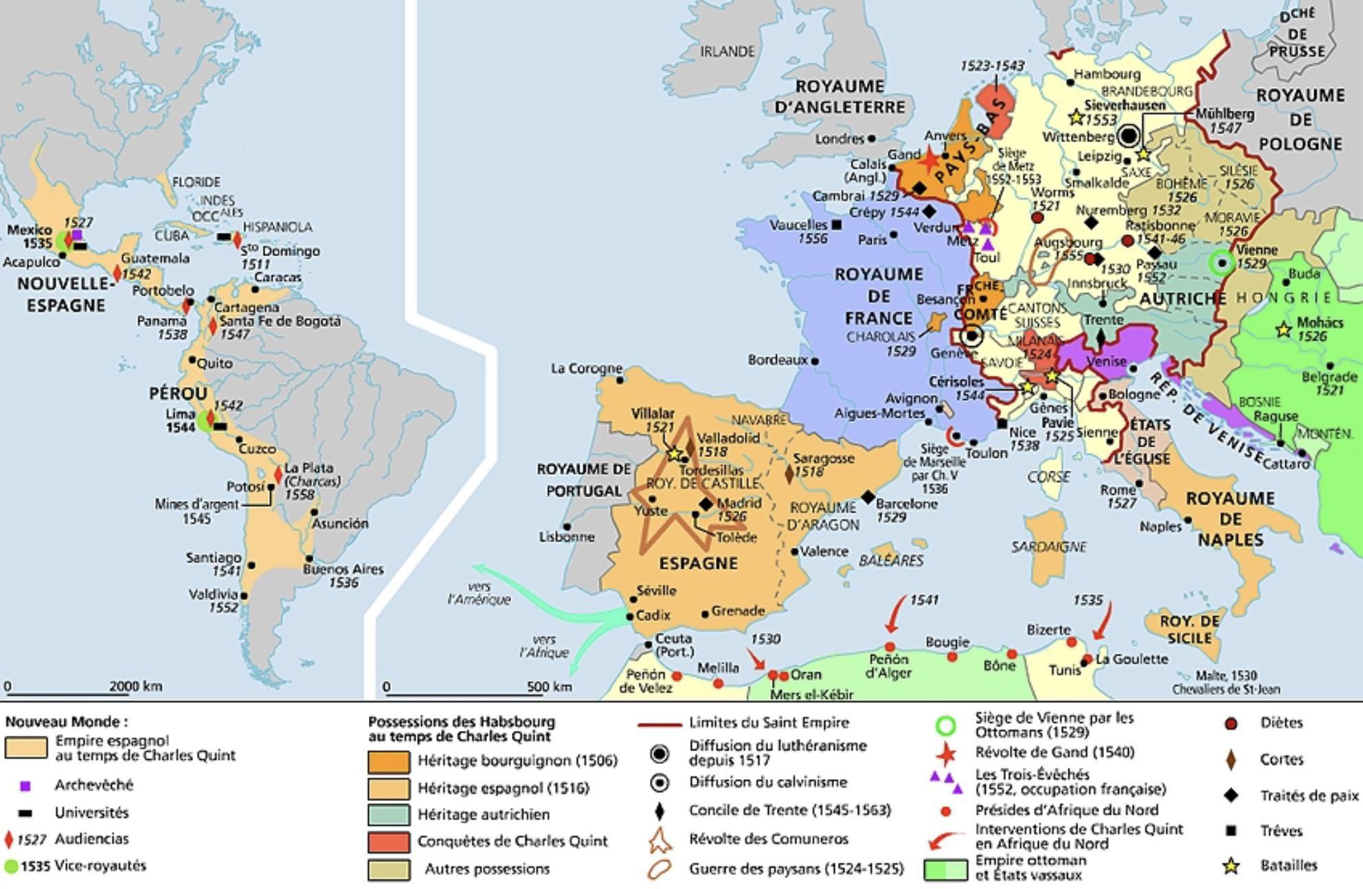 Charles Quint sur l'Espagne, l'Italie, l'Autriche, les Pays-Bas et le Saint-Empire.