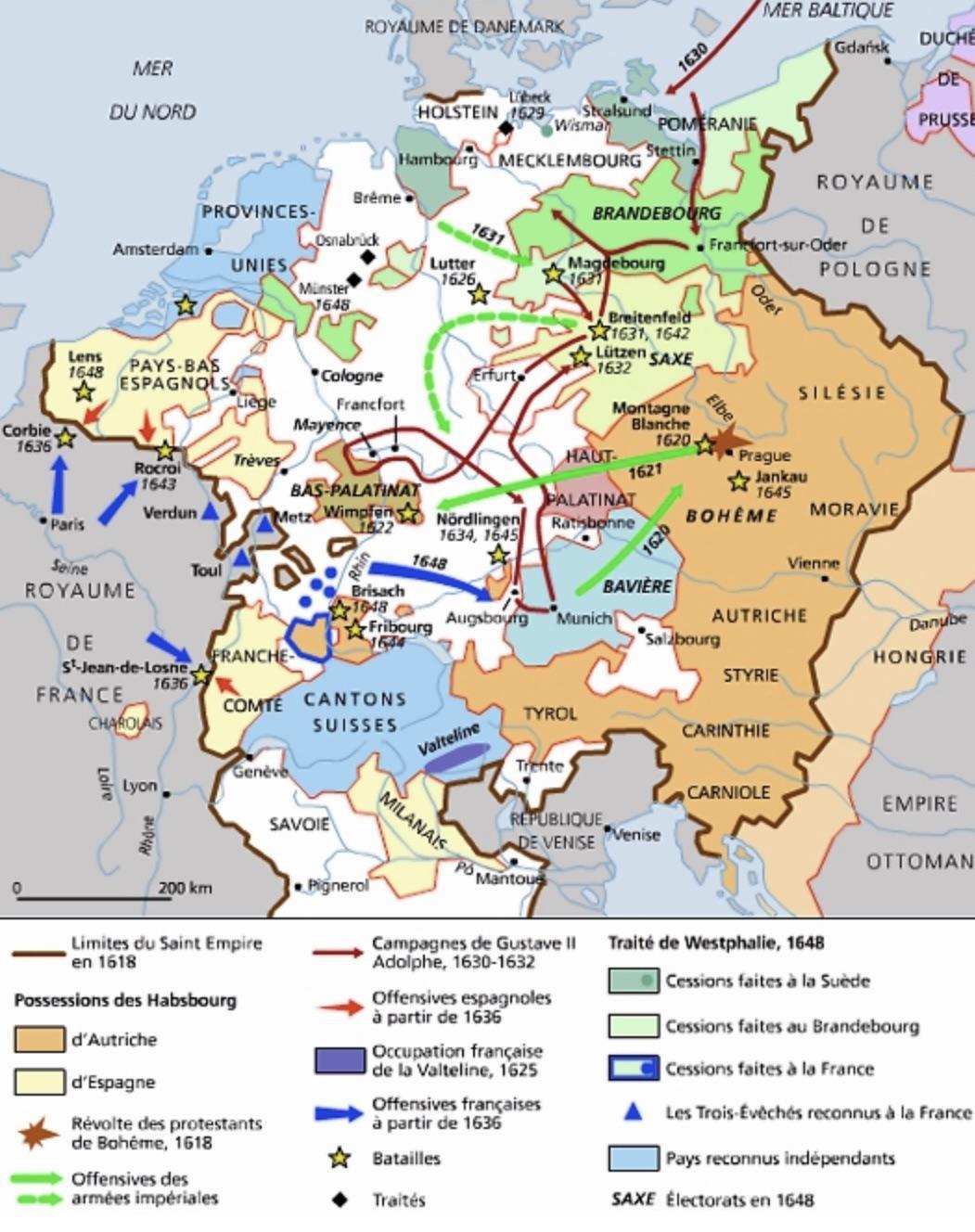 Rappel de la géographie de la guerre de 30 ans. Sur la carte, certaines victoires de Condé dans les Flandres et en Allemagne