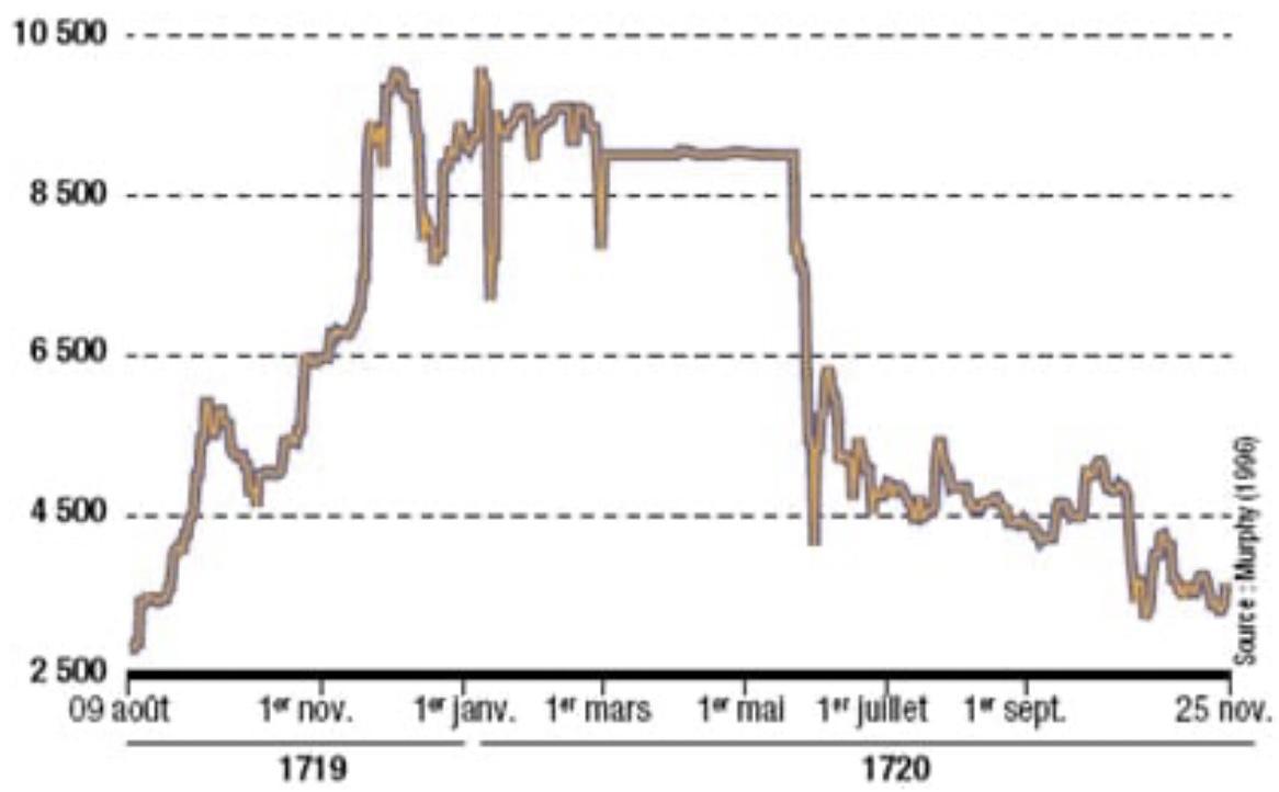 Le "coup de bourse" de John Law : la hausse, la stagnation du prix (maintenu artificiellement par Law), puis la chute brutale des actions de la Compagnie du Mississippi, quand Law ne peut plus racheter ses propres actions.