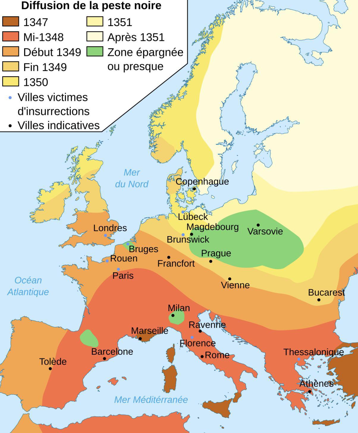 La situation du royaume se détériore encore avec l’arrivée de la peste noire en 1348. Venue d’Italie par les ports méditerranéens, la pandémie se répand rapidement dans tout le royaume. Elle provoque une mortalité foudroyante, touchant indistinctement villes et campagnes, clergé, noblesse et roture.