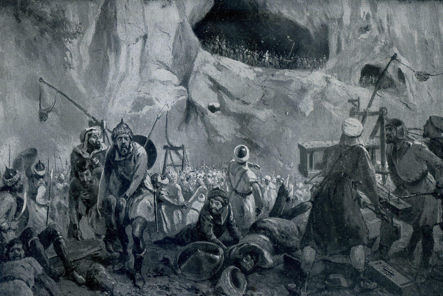 Les chrétiens, réfugiés dans une grotte, bombardent les musulmans de pierres durant la bataille de Covadonga.