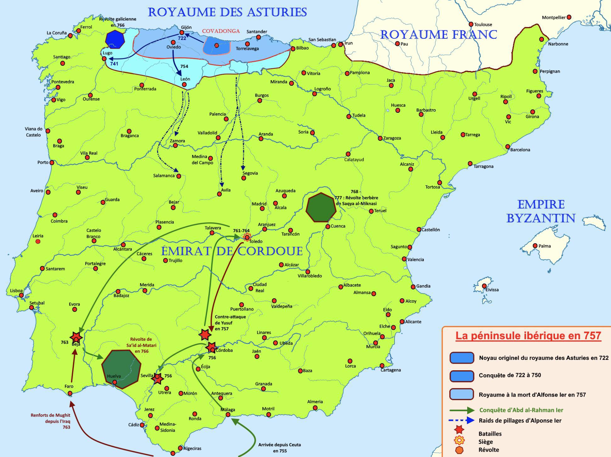 Le royaume des Asturies en 757. Contrairement à la carte, les pyrénées échappent largement à la domination musulmane.