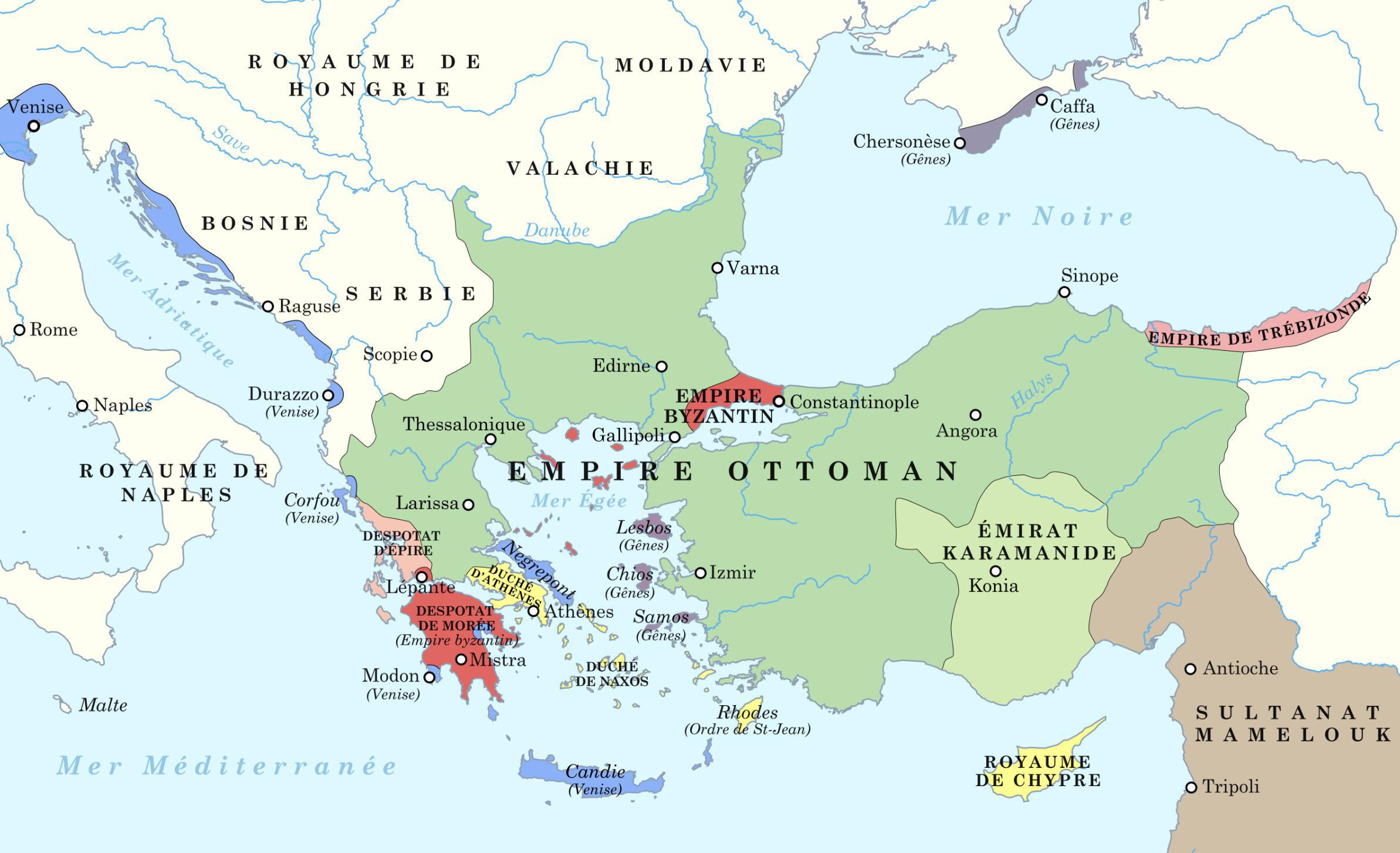 En 1354, les Ottomans franchirent les Dardanelles et s’établirent en Europe. À partir de là, ils multiplièrent les conquêtes dans les Balkans, encerclant progressivement Constantinople.
