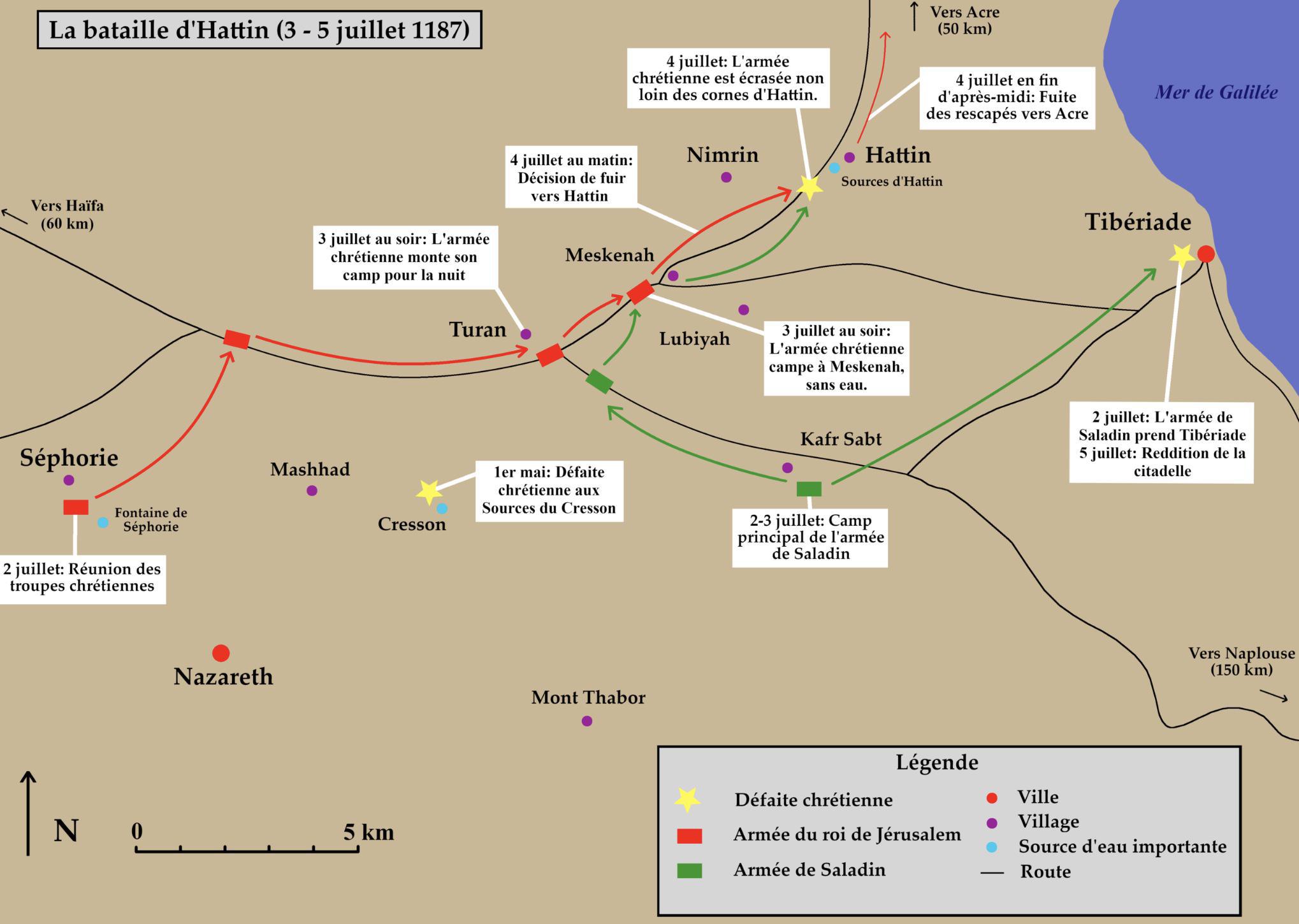Le 2 juillet 1187, l’armée franque se rassembla à Séphorie, une position défensive forte, pour répondre à l’attaque de Saladin contre Tibériade. Là, un conseil de guerre se réunit. Raymond de Tripoli, fin stratège, recommanda d’attendre Saladin à Séphorie, où les croisés disposaient d’eau et de vivres en abondance. Mais Gérard de Ridefort, grand maître des Templiers, accusa Raymond de trahison et plaida pour une marche immédiate vers Tibériade.