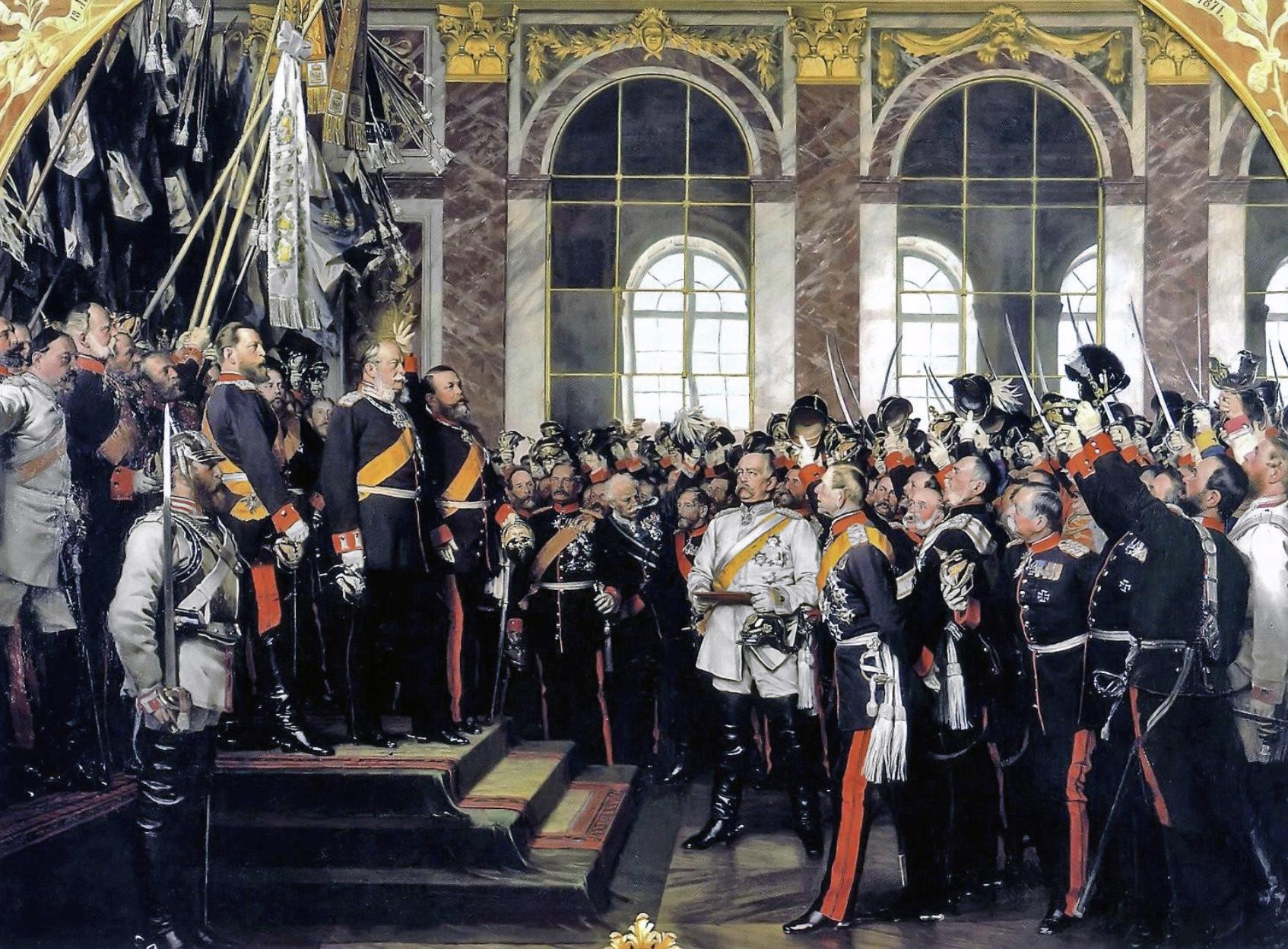 Les princes allemands reconnaissent Guillaume Ier comme l'Empereur des allemands, unissant les nations allemandes dans un même Empire. La scène a lieu dans la gallerie des glaces du château de Versailles.