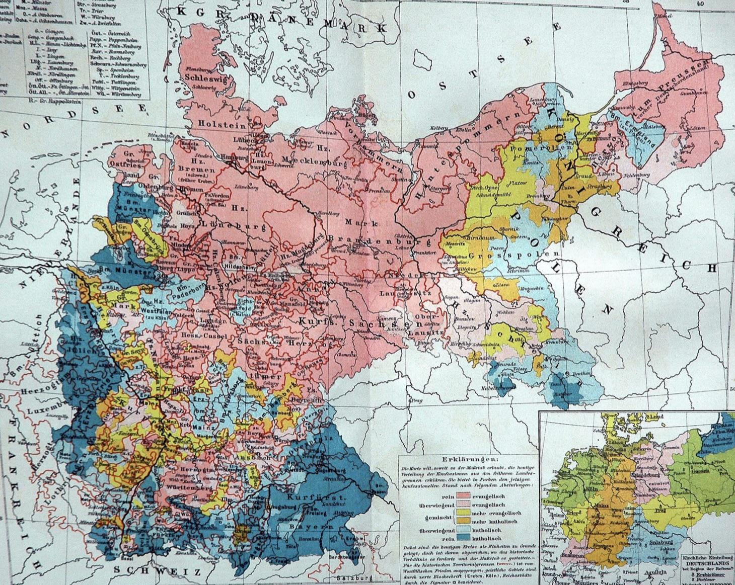 Carte : les régions à majorité protestante (rose) et catholique (bleu)