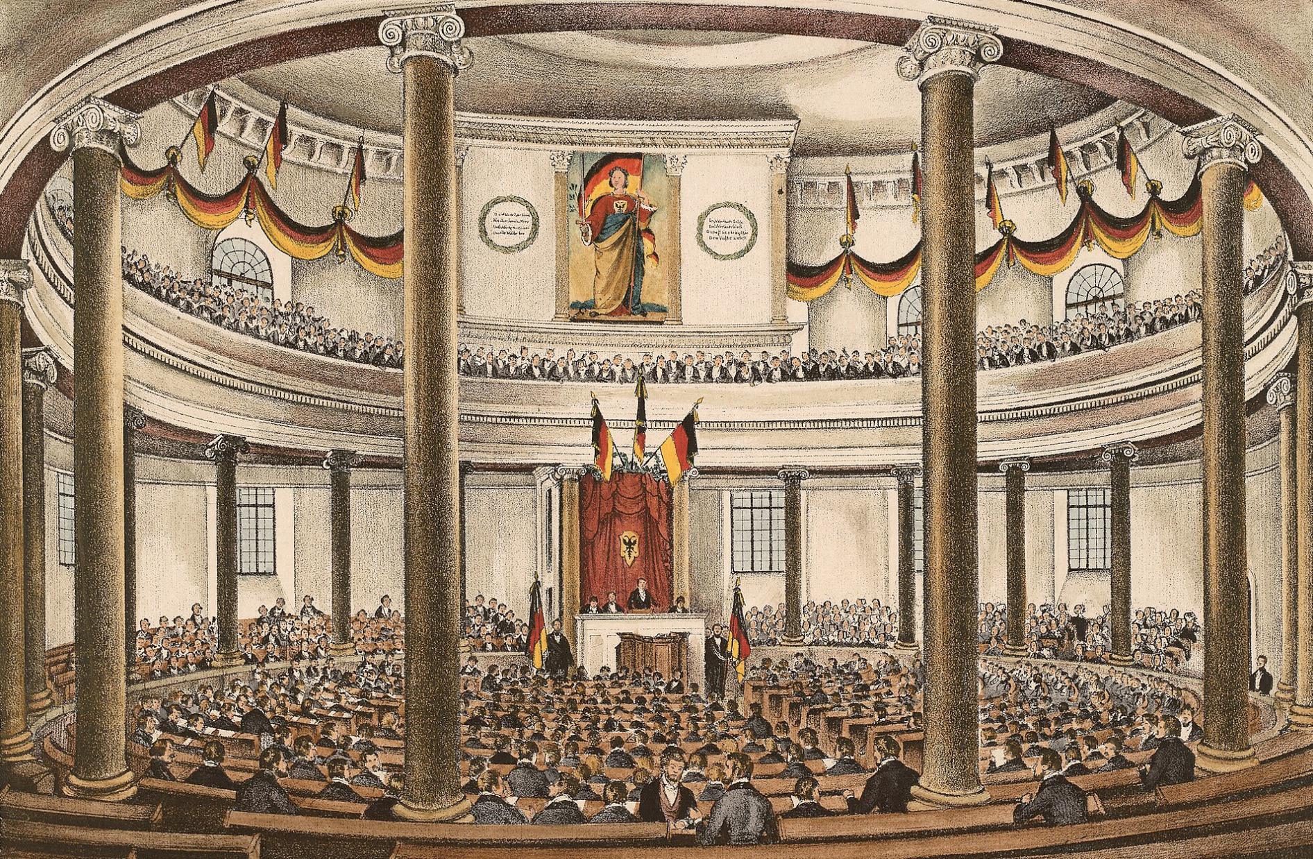 Le cœur de ce mouvement est le Parlement de Francfort, élu au suffrage censitaire au printemps 1848 et réuni dans l’église Saint-Paul. Composé de juristes, professeurs, journalistes, avocats, ce parlement libéral a pour mission de forger une constitution allemande et de définir les contours d’un État-nation. C’est la première assemblée représentative de l’histoire allemande à se revendiquer au nom du peuple.