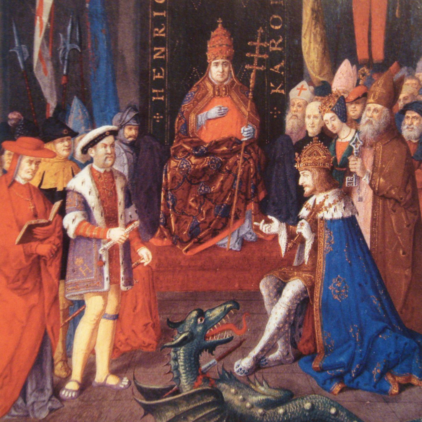 Henri VIII (à gauche) avec le Pape et Charles Quint
