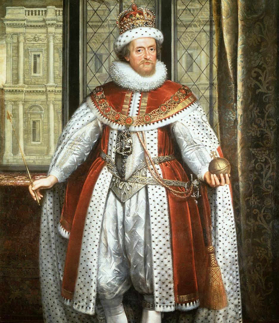 Jacques Ier pose avec un sceptre et une orbe royale, deux attributs symboliques du pouvoir de droit divin.