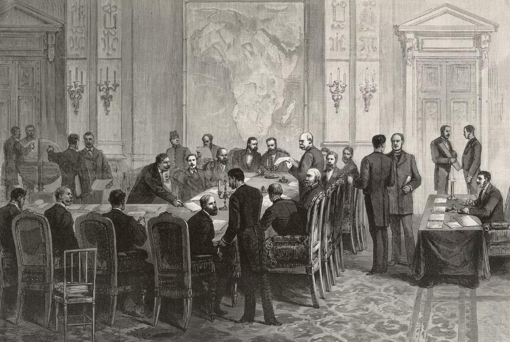 La Conférence de Berlin, en 1885, durant laquelle les puissances européennes ont négocié le partage de l'Afrique, pour éviter que la course aux colonies ne dégénère en un conflit dévastateur.