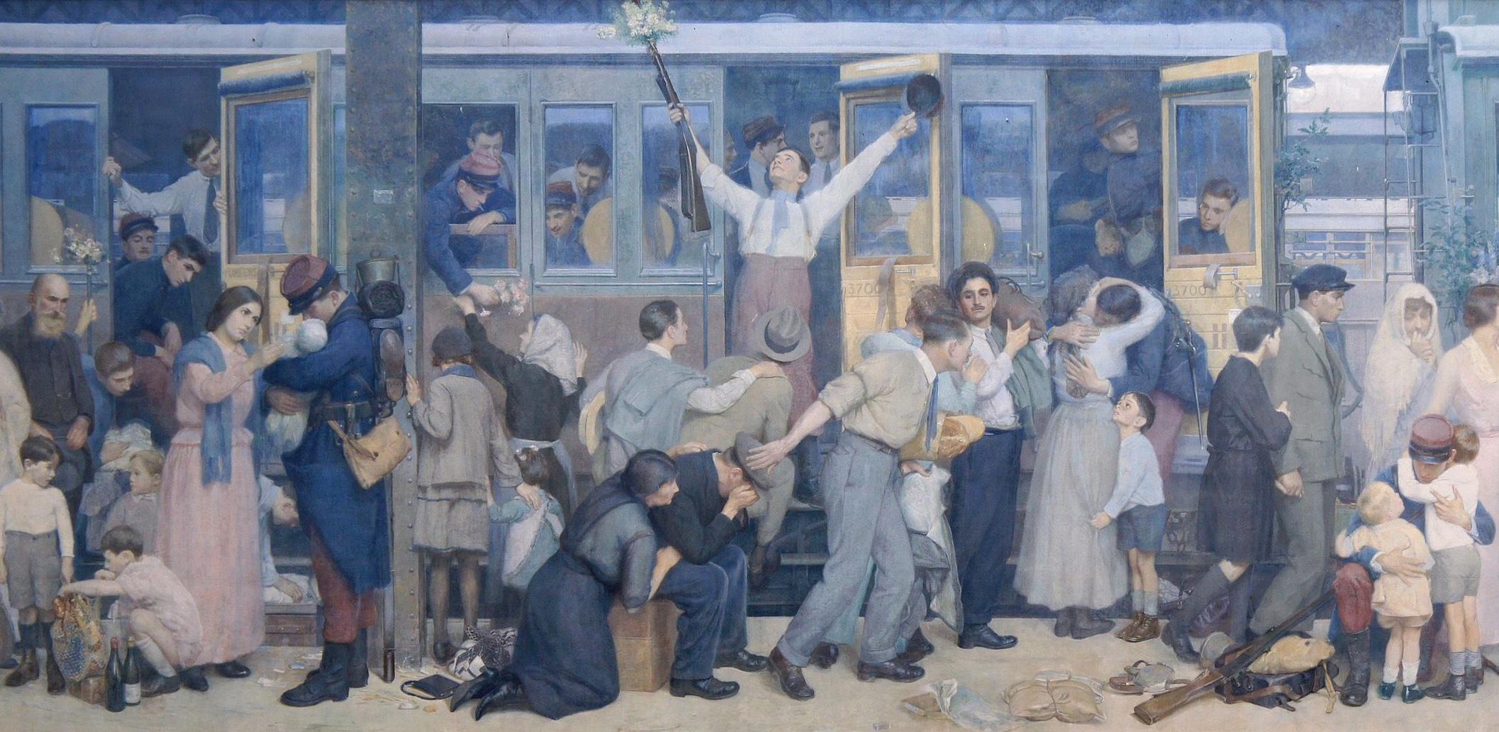 Des soldats français sont encouragés par des femmes, alors qu'ils partent au front, le sourire aux lèvres.