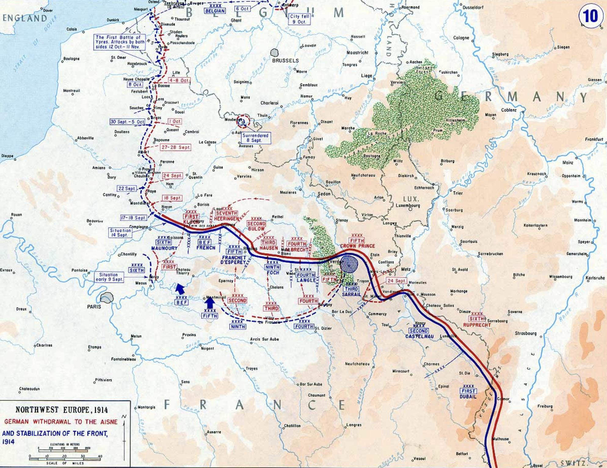 Entre septembre et novembre 1914, de nombreuses batailles se succèdent : l’Aisne, l’Artois, la Flandre, et surtout Ypres, où les forces britanniques, françaises et allemandes s’affrontent dans des combats acharnés.