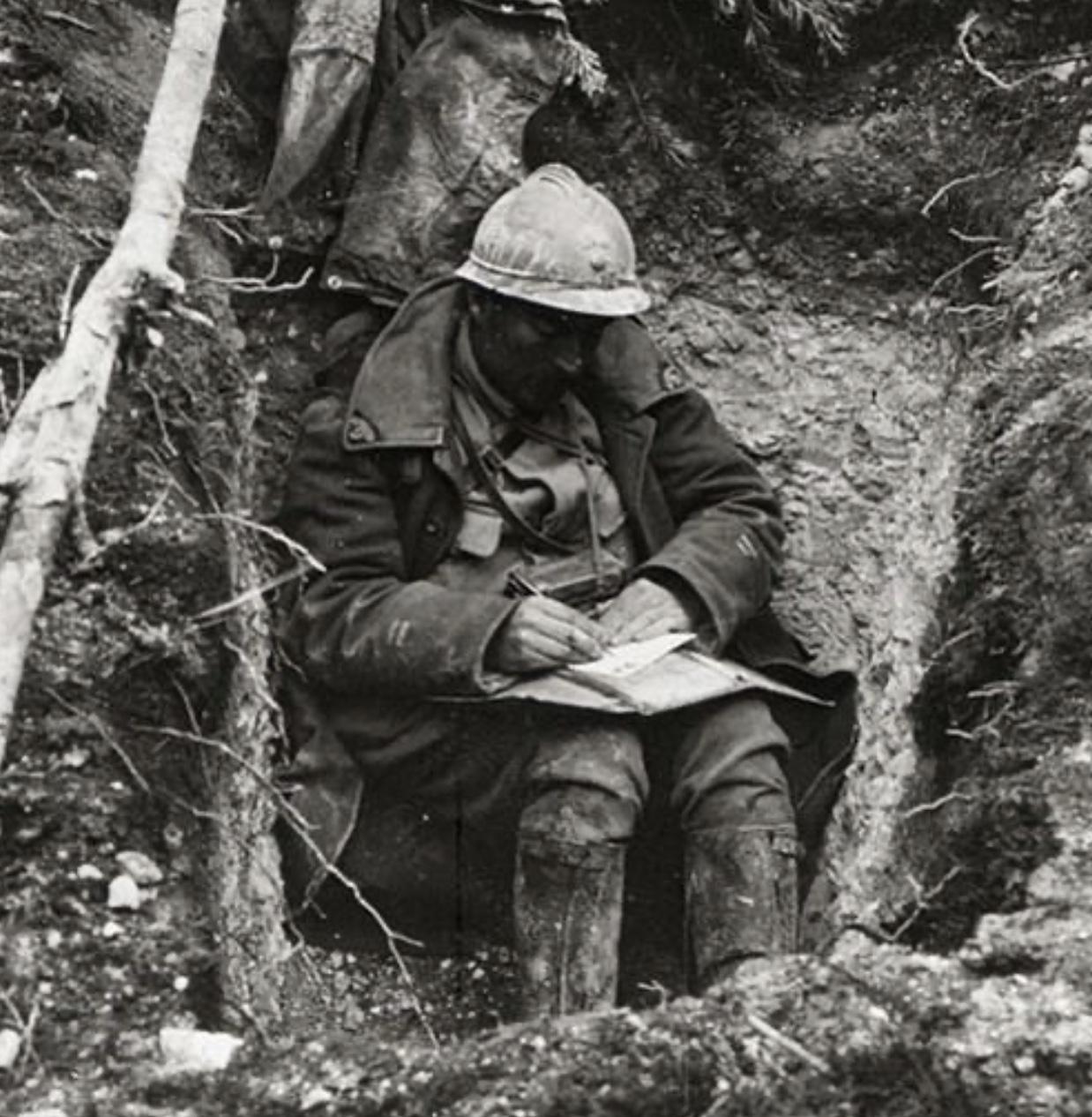 Un soldat français écrit une lettre, à Verdun.
