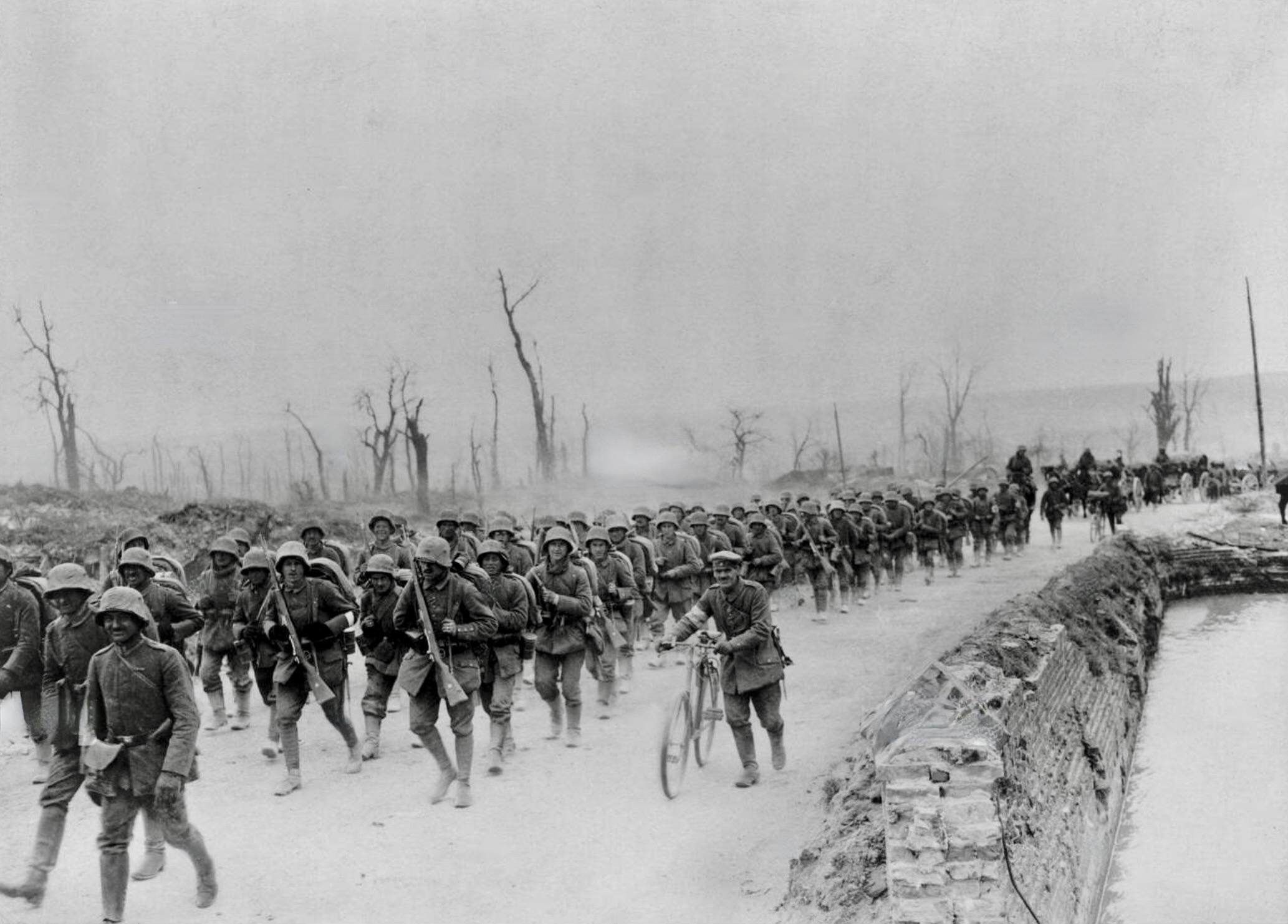 Colonne de soldats allemands en route vers le front, dans leur nouvel uniforme.