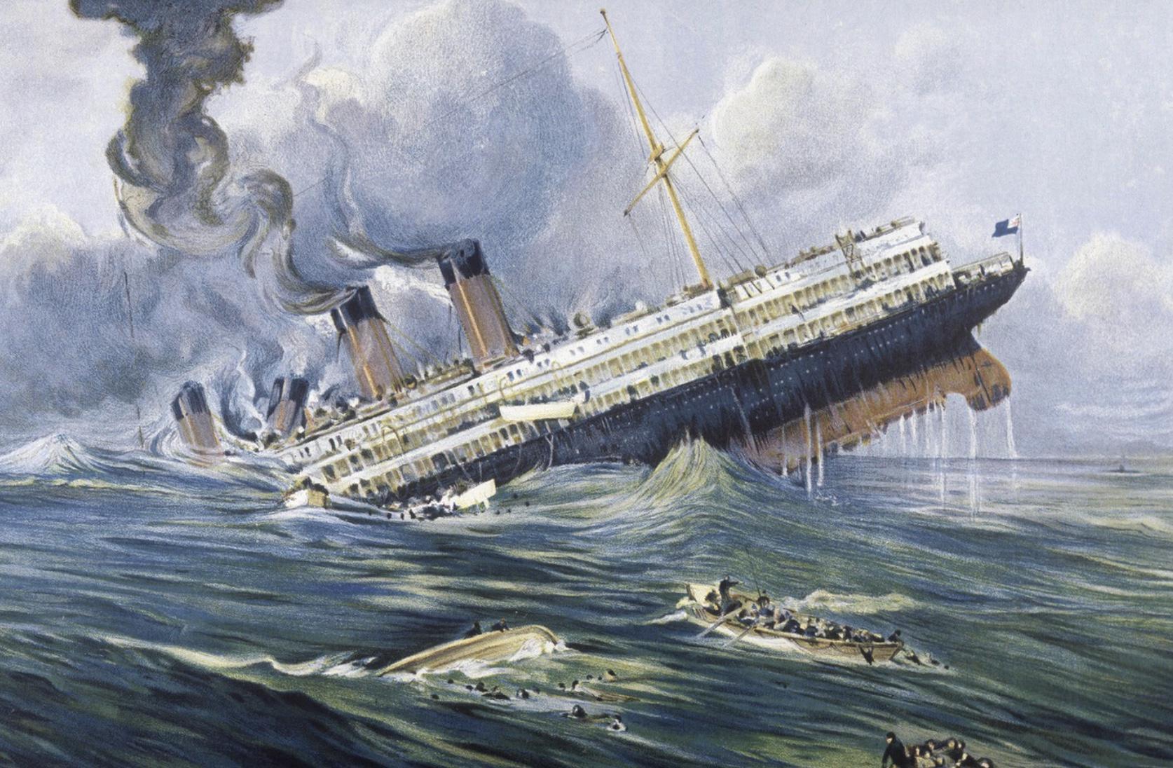 Le torpillage du Lusitania, paquebot de transport, par un sous-marin allemand en 1915.
