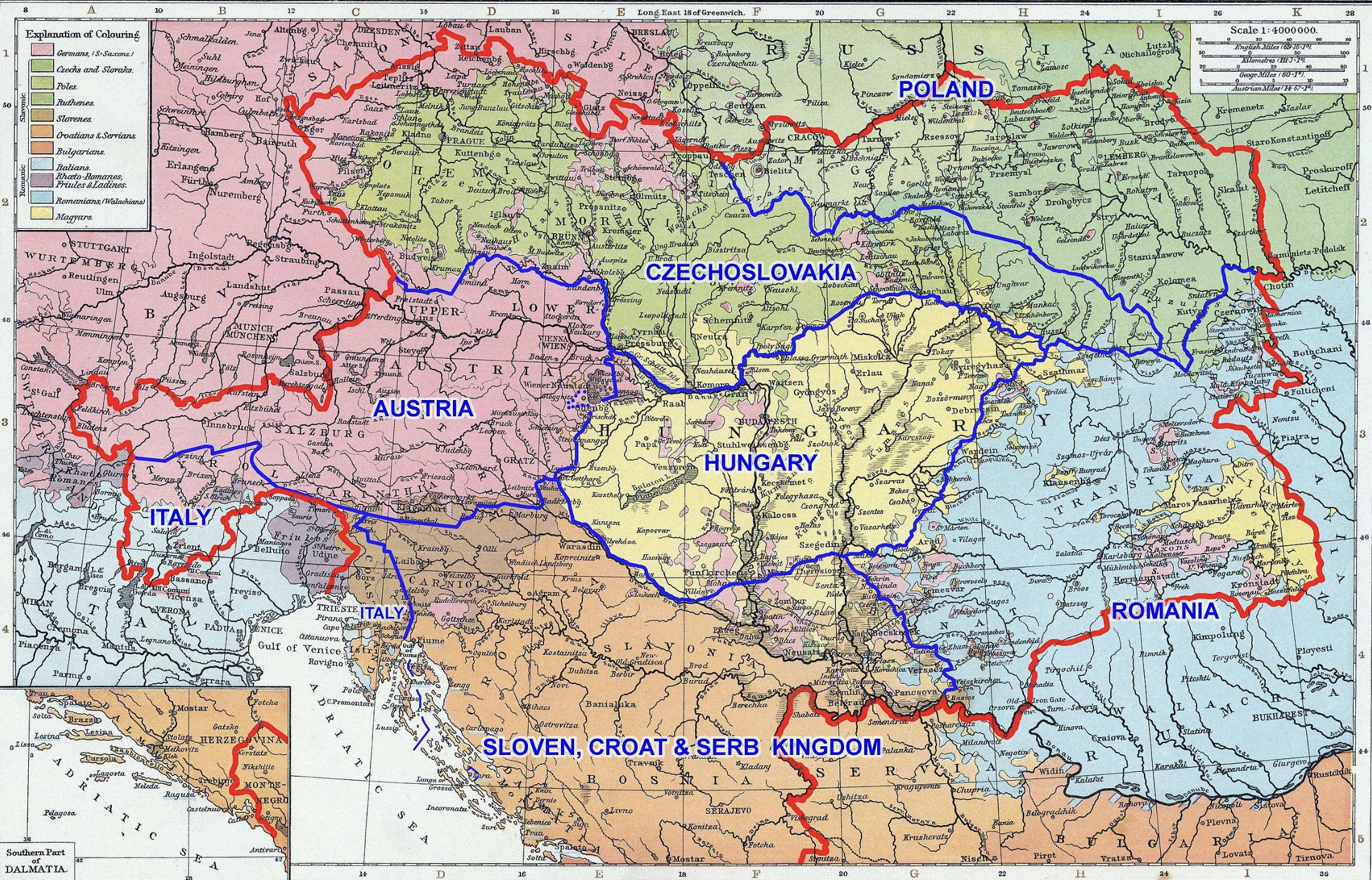 Carte : en bleu, les frontières des nouveaux états, issus de la dislocation de l'Autriche-Hongrie