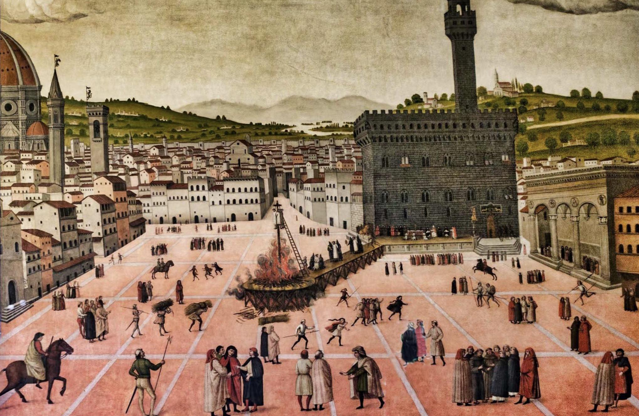 À Florence, le pouvoir passe alors entre les mains du moine dominicain Girolamo Savonarole, qui instaure un régime théocratique radical. Opposé au luxe et à la corruption, il prêche un retour à la rigueur chrétienne et ordonne le célèbre Bûcher des Vanités, où des œuvres d’art, des bijoux et des livres sont brûlés publiquement.